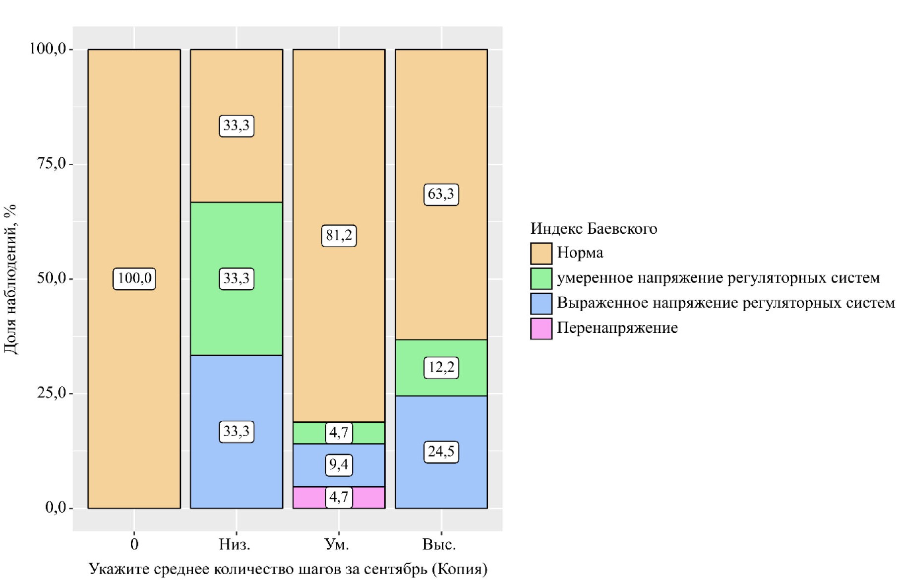 Текущая оценка уровня физической активности, использующая количество шагов в день как основной параметр, является допустимым и широко применяемым методом в исследованиях (рис. 2). Однако ее можно дополнить более комплексными показателями, такими как участие в спортивных занятиях, продолжительность и интенсивность физических нагрузок, а также использование метрик, полученных с помощью носимых устройств, которые фиксируют разнообразные аспекты активности. Такие дополнительные данные позволили бы получить более детализированное представление о влиянии различных уровней активности на вегетативную нервную систему и адаптационные способности участников.
