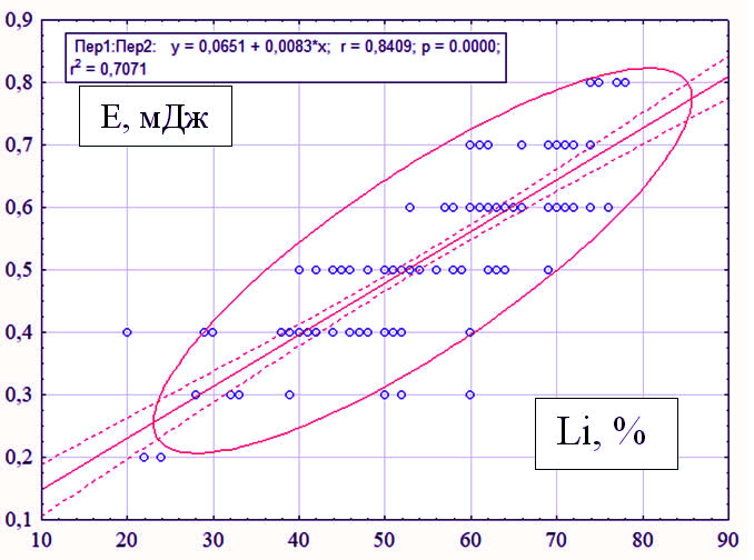 Отмечалась достоверная зависимость уровня лазерной энергии от показателя Lightness index (Li), которая выражалась формулой: E = 0,0651 + 0,0083 × Li. При коэффициенте корреляции (rх/y = 0,84, p = 0,00001).