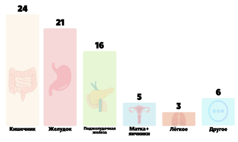Распределение пациентов по локализациям ЗНО показано на рис. 1. Наибольшее число пациентов в исследуемой когорте составили больные с опухолями кишечника (32 %), желудка (28 %) и поджелудочной железы (21 %). В раздел «Другое» были отнесены 6 пациентов: 3 пациента с новообразованием печени, 2 – в почке, 1 – с опухолью забрюшинного пространства.
