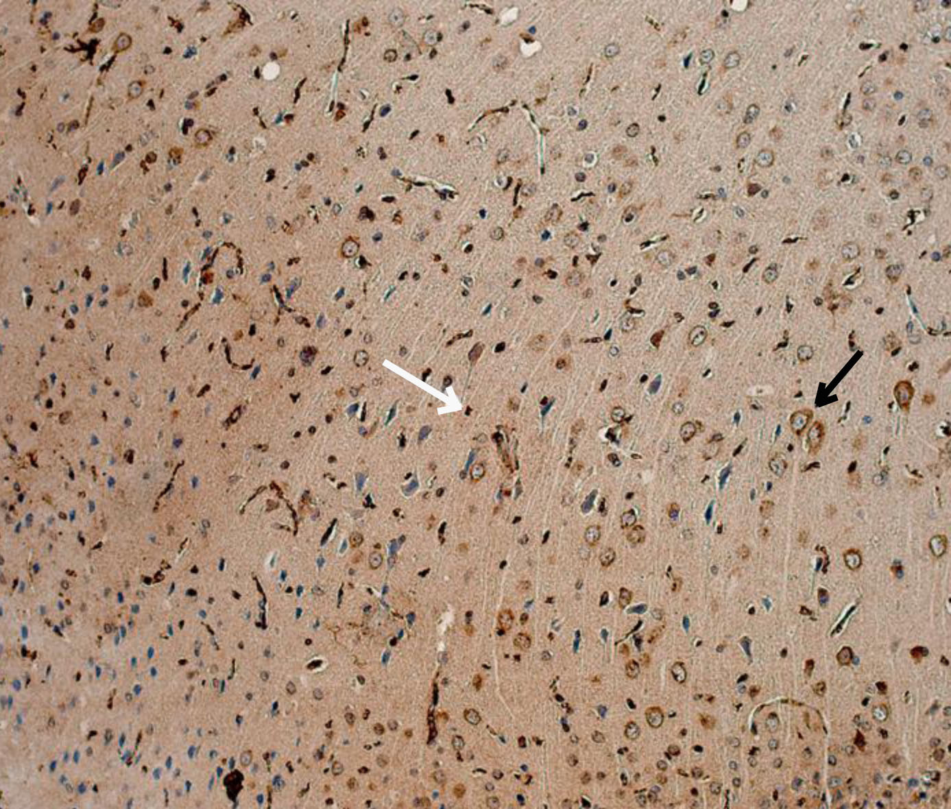 Рис. 4. Животное с СД1 (лечение – сукцикард) – от слабой до умеренной экспрессия ИРМ IL-6. Иммуногистохимическое исследование, антитела против IL-6. Увеличение ×200. Черные стрелки – экспрессия в неповрежденных нейронах. Белые стрелки – экспрессия в нейропиле