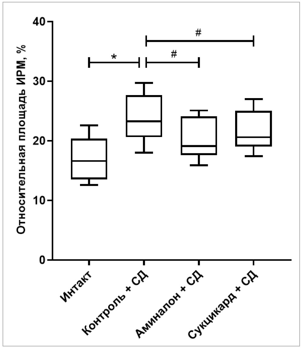 * Различия между группами СД1 и интакта статистически значимы (Anova-Тест), p < 0,01; # различия между группами СД1, аминалона и сукцикарда статистически значимы (Anova-Тест), p < 0,01.