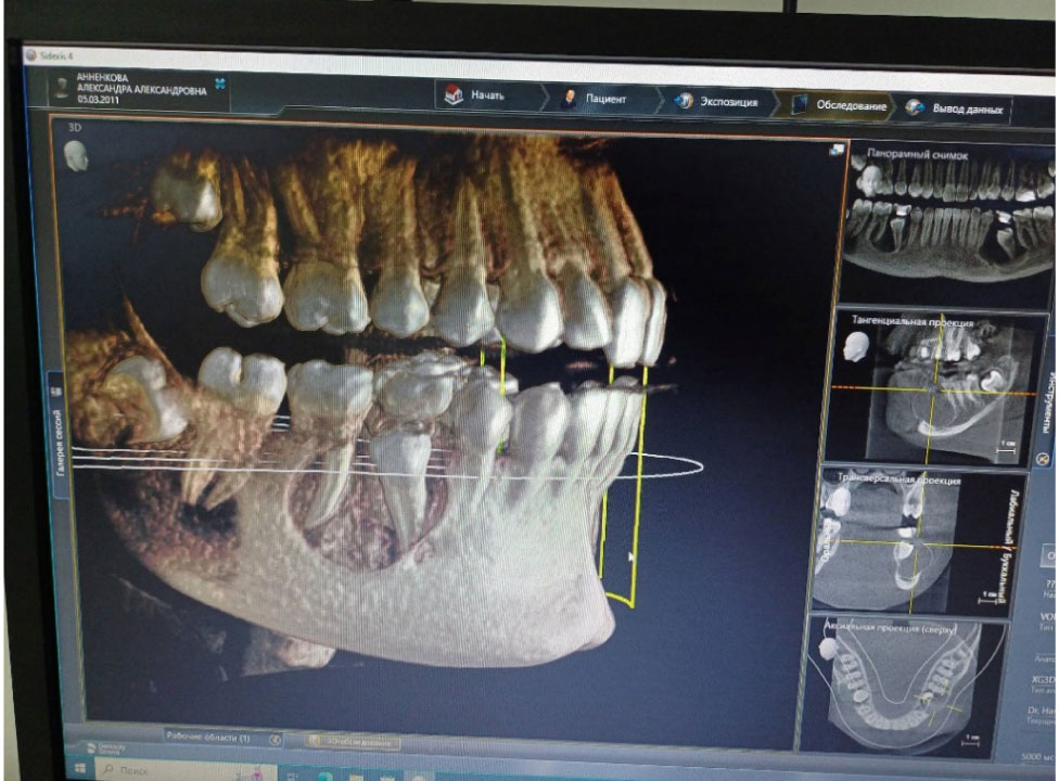 На изображениях конусно-лучевой компьютерной томографии определялась однокамерная костная полость, включающая зачаток прилежащего постоянного зуба. Оптическая плотность костной ткани в зоне деструкции составляла 400-750 HU по шкале Хаунсфилда (рис. 1).