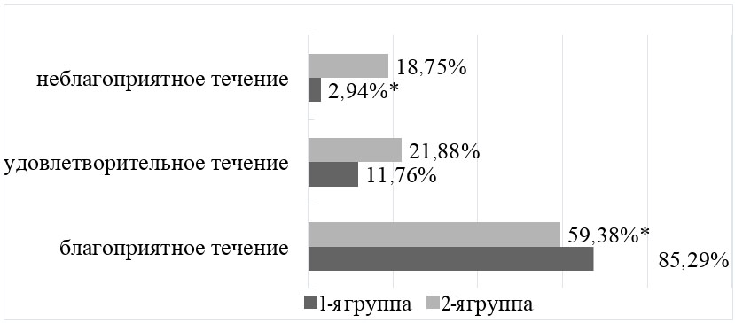 Благоприятное течение послеоперационного периода наблюдалось у достоверно большего количества пациентов 1-й группы, (85,29 ± 6,08) %, в то время как неблагоприятное течение ближайшего послеоперационного периода преобладало достоверно чаще у детей 2-й группы (p < 0,05) (рис. 2).