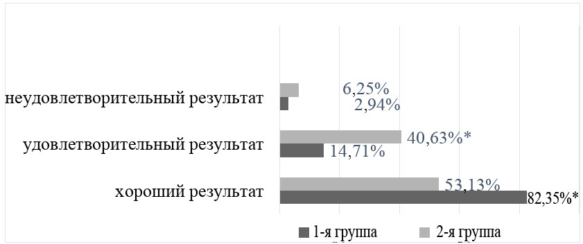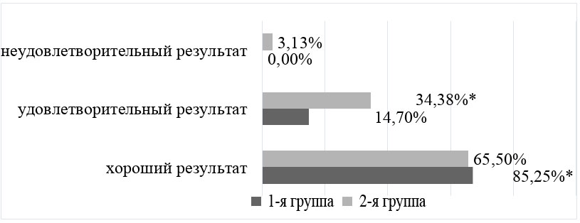 Сравнительный анализ промежуточных результатов выявил преобладание хорошего результата в 1-й группе в 1,5 раза (p < 0,05). Неудовлетворитель-ный результат в 2 раза чаще встречался во 2-й группе, но различия оказались статистически не значимы (p > 0,05) (рис. 3).