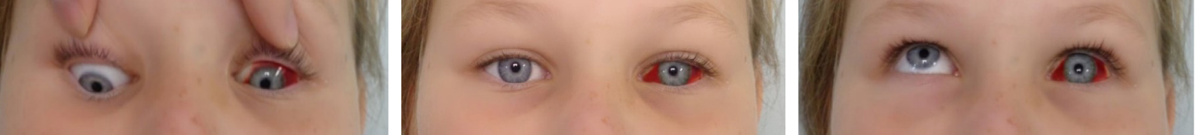 Клинический пример 1. Родители пациентки С. 10 лет обратились с жалобами на ограничение подвижности левого глаза вверх и двоение. Из анамнеза известно, что неделю назад девочка ударилась головой при падении. По данным компьютерной томографии (КТ), слева имеется трещина нижней стенки орбиты в средней трети шириной 2 мм. В зоне локализации перелома – дефект нижней прямой мышцы, предположительно разрыв, пролапс мягких тканей орбиты в верхне-челюстную пазуху до 9 мм. При объективном осмотре в первой позиции взора выявлена ортотропия и полное отсутствие подвижности левого глаза кверху (рис. 1). Пациентке поставлен диагноз: перелом нижней стенки орбиты, разрыв нижней прямой мышцы. Рекомендована ревизия зоны перелома и нижней прямой мышцы cito.