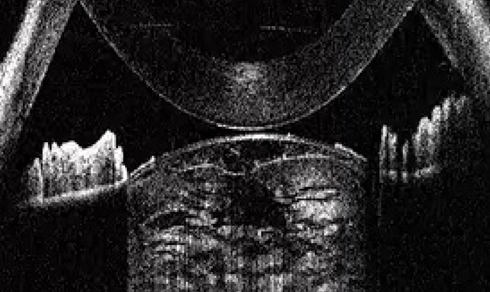 Рис. 3. Тип 3 перезрелой катаракты: выпуклая передняя капсула хрусталика, гиперрефлективные полосы набухших кортикальных волокон, внутрихрусталиковые щели, области однородного вида «матового стекла»