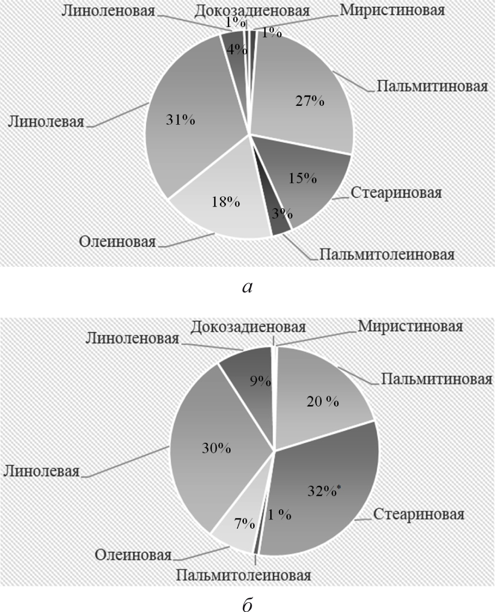 Рис. Процентное распределение жирных кислот в силиконовом масле, извлеченном у пациентов после завершения тампонады при лечении отслойки сетчатки: а – I группа (без видимых признаков эмульгации); б – II группа (с видимыми признаками эмульгации)