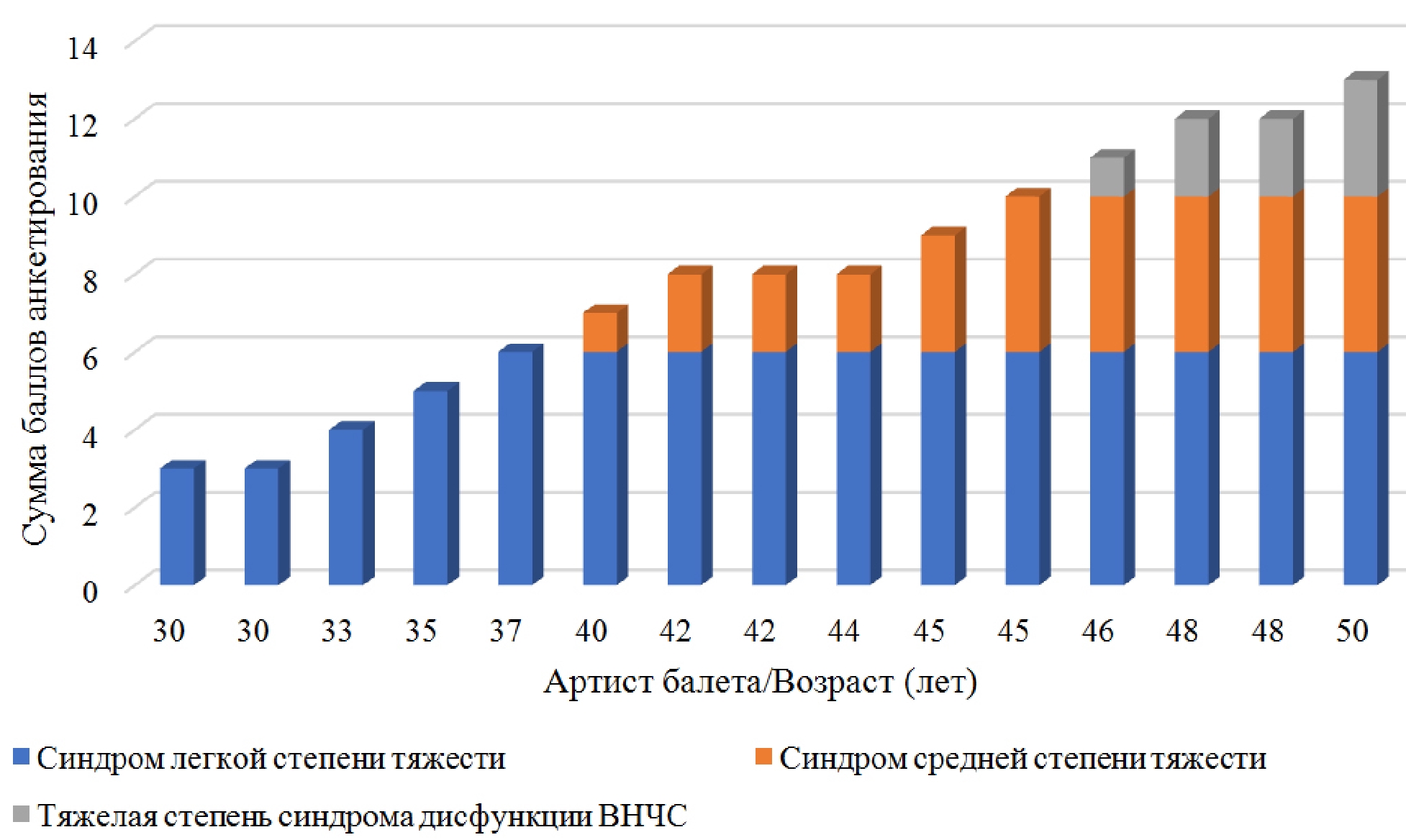 - 3–6 баллов – синдром легкой степени тяжести – выявилось у 5 (33 %) артистов балета старше 30 лет;