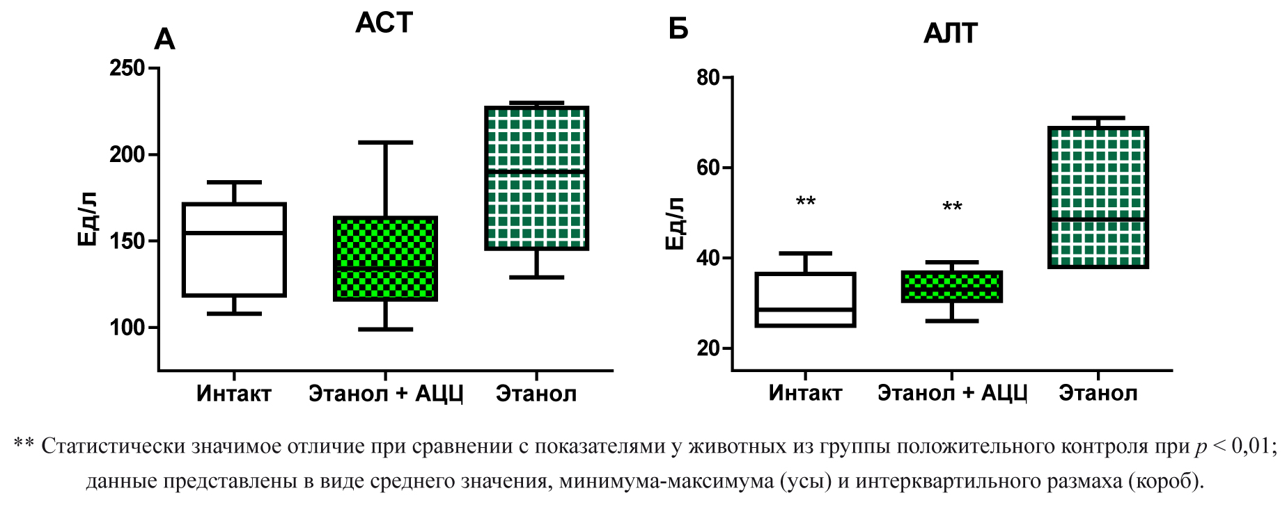 Не выявили статистически значимых отличий между показателями активности АСТ в перфузате печени крыс из групп положительного, отрицательного контроля и из опытной группы (рис. 1 А). Активность АЛТ у животных из группы положительного контроля (52,00 ± 15,14) Ед/л и у животных, которым после интоксикации вводили ацетилцистеин (33,17 ± 4,36) Ед/л оказалась статистически значимо (p < 0,01) ниже, чем у животных, которым после интоксикации вводили физиологический раствор (30,50 ± 6,38) (рис. 1 Б).
