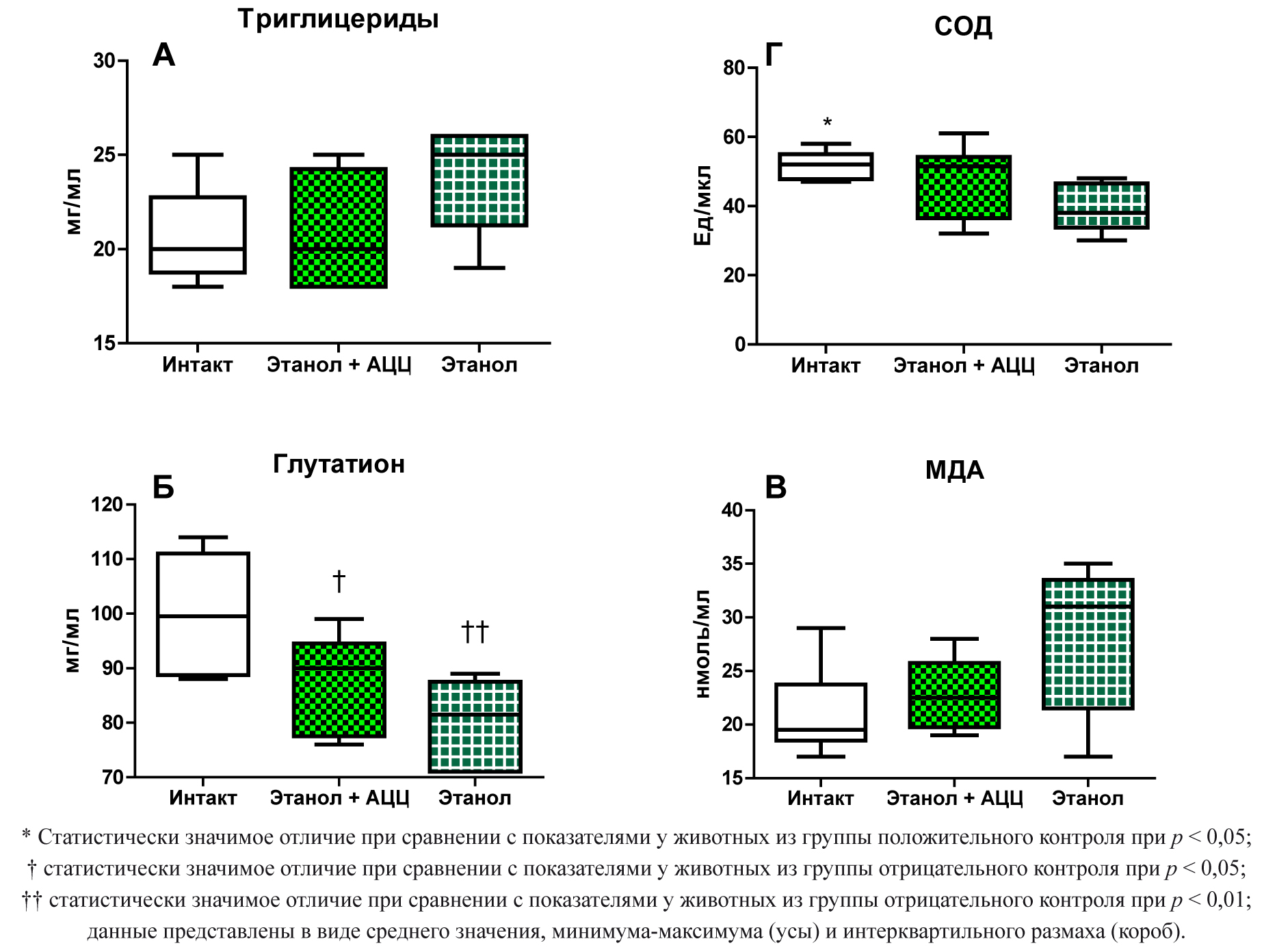 Не выявили статистически значимых отличий между показателями концентрации ТГ в перфузате печени крыс из групп положительного, отрицательно контроля и из опытной группы (рис. 2 А). Концентрация глутатиона в перфузате печени крыс, получавших только этанол без лечения, была статистически значимо ниже (p < 0,01), чем у животных из группы отрицательного контроля. Данный показатель также был статистически значимо ниже (p < 0,05) у животных, получавших ацетилцистеин после интоксикации этанолом (рис. 2 Б). Не обнаружили статистически значимых отличий между показателями концентрации МДА у животных всех исследуемых групп (рис. 2 В). Обнаружили статистически значимое отличие показателей активности СОД у интактных животных при сравнении с показателями у животных, которым вводили этанол без лечения (p < 0,05). Показатель у животных, получавших ацетилцистеин, не отличался статистически значимо от показателей у животных из групп положительного и отрицательного контроля (рис. 2 Г).