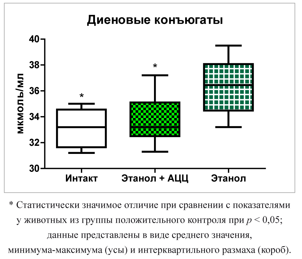 Таким образом, концентрация диеновых конъюгатов в перфузате существенно увеличивалась при алкогольной интоксикации и приближалась к значениям у интактных животных при введении ацетилцистеина в постинтоксикационном периоде.