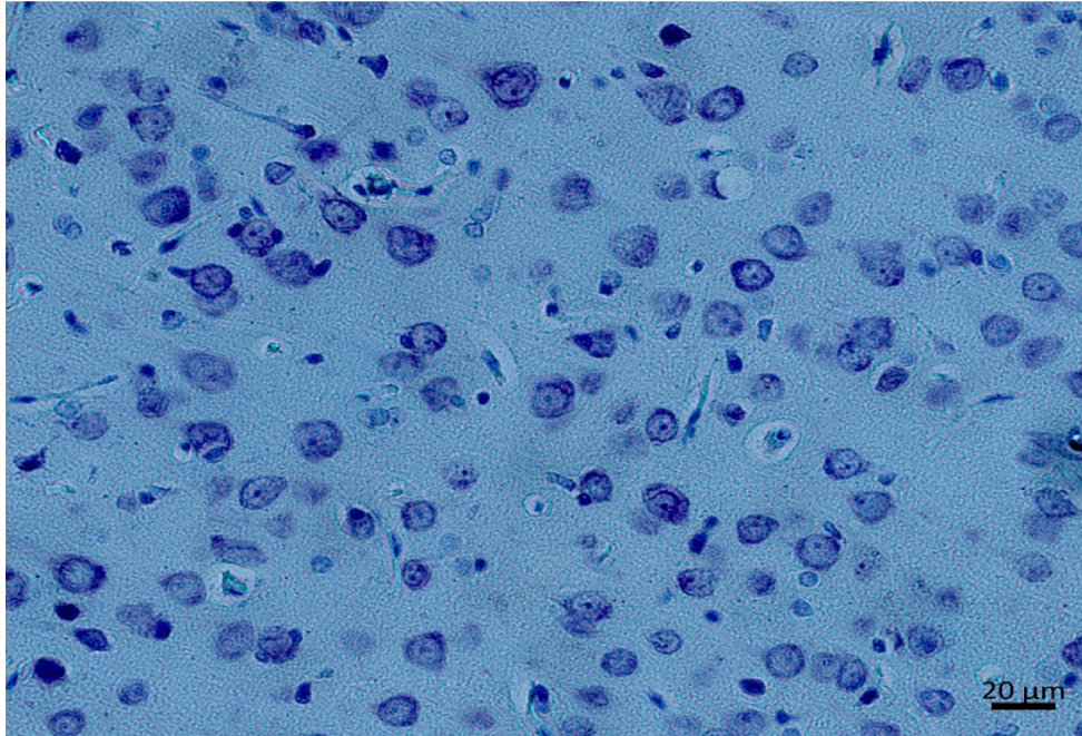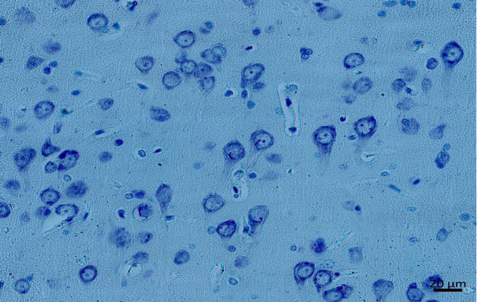 После курсового 30-дневного лечения проводили эвтаназию (декапитация под хлоралгидратным наркозом, 450 мг/кг) с последующим забором образцов тканей ГМ. Материал фиксировали в течение 24 часов в 10%-м растворе нейтрального забуференного формалина (pH 7,4), обезвоживали и заливали в парафин по общепринятой гистологической методике. На роторном микротоме изготавливали срезы толщиной 4–5 мкм. Окрашивали парафиновые срезы тионином по методу Ниссля.