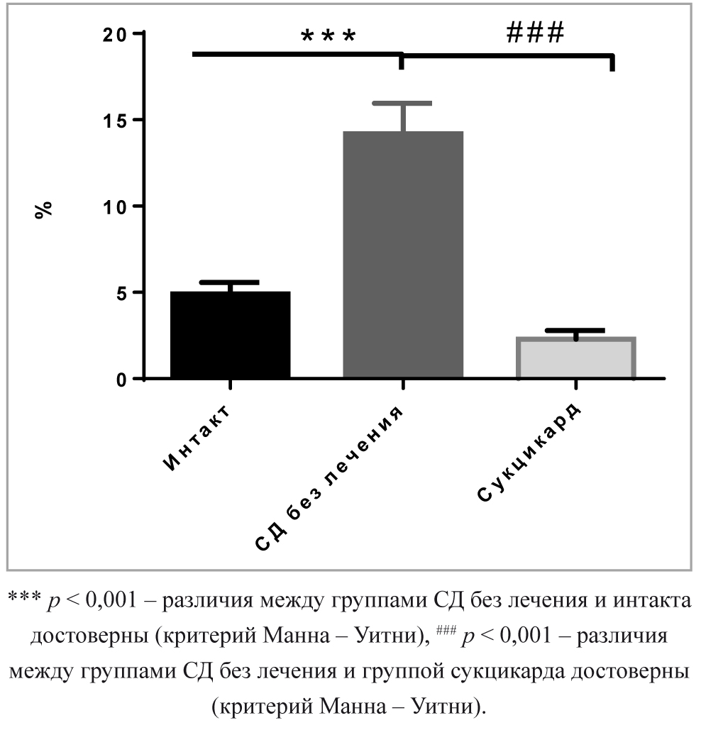 В качестве патологии была выбрана экспериментальная модель, рекомендованная для изучения отдаленных последствий СД, в которой с целью формирования его осложнений используют крыс со стрептозотоциновым диабетом длительностью 6 месяцев. Стрептозотоцин-индуцированный СД моделировали однократным внутрибрюшинным введением растворенного в цитратном буфере (0,1 М, рН 4,5) стрептозотоцина (Sigma, США) в дозе 60 мг/кг после пищевой депривации. В исследование брали животных с уровнем тощаковой (забор корма за 4 часа до измерения) гликемии ≥ 11,1 ммоль/л через 3 дня и 6 месяцев после инъекции. Для измерения уровня гликемии использовали глюкометр Contour TS и соответствующие тест-полоски (Bayer). Забор крови производили из подъязычной вены [7]. Лечение начинали через 6 месяцев после моделирования СД. Группе негативного контроля вводили физиологический раствор (крысы с СД без лечения). Исследуемое вещество, сукцикард, вводили перорально в течение 30 дней в дозе 50 мг/кг. В качестве позитивного контроля использовали крыс без СД (группа интакта) той же партии животных.