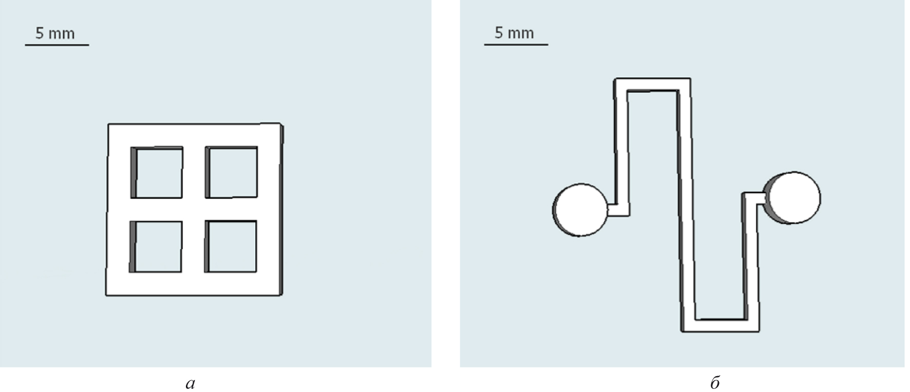 Рис. 1. Компьютерные 3D-модели печатаемых конструктов: А – конструкция в виде квадратной решетки со стороной 13,5 мм для печати биочернилами I (на основе желатина и ксантановой камеди) и II (на основе желатина и альгината натрия) типов; Б – паттерн в виде зигзагообразной прямоугольно изогнутой линии с приподнятыми площадками на концах для печати биочернилами III типа, содержащими углеродные нанотрубки