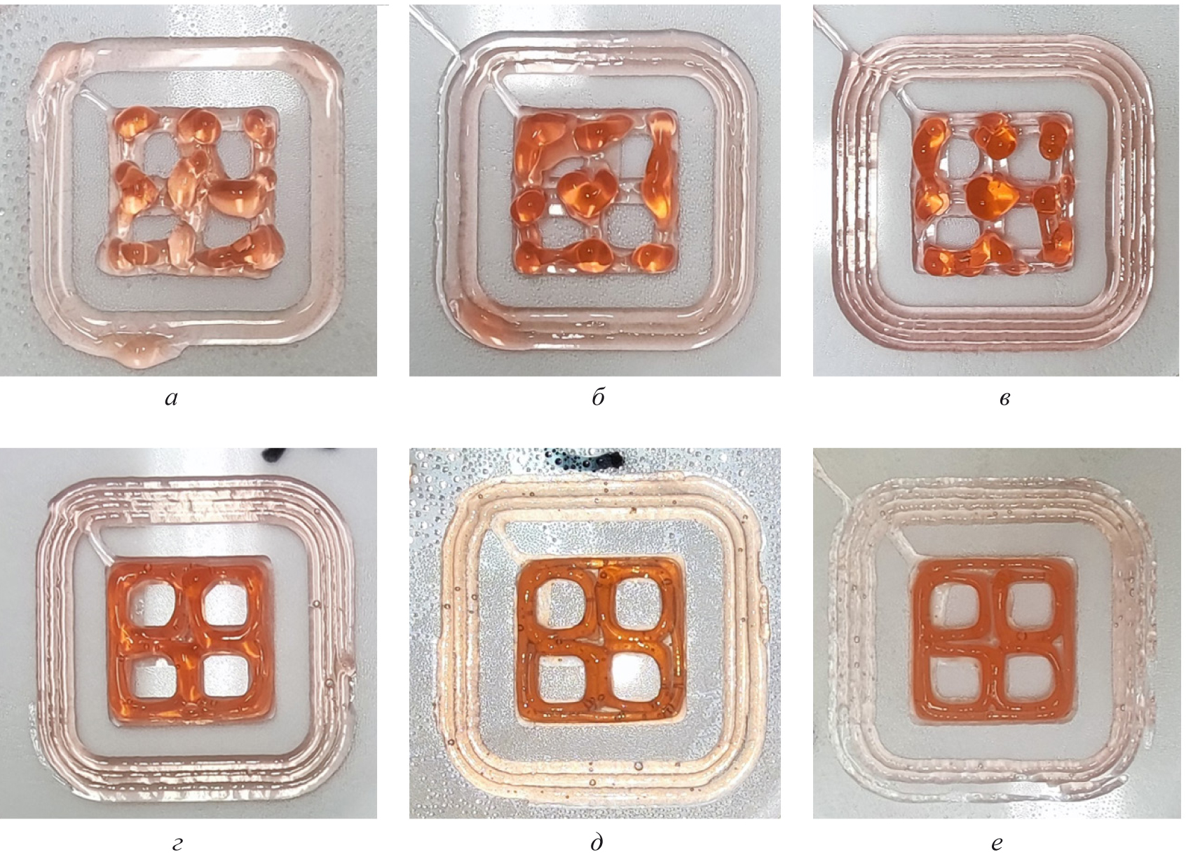 Выполнена печать трехмерных конструктов чистым желатином и растворами, содержащими желатин и ксантановую камедь в различных концентрациях (биочернила I типа). Хотя охлаждение платформы препятствовало растеканию биочернил, благодаря переходу желатина в состояние геля, концентрация ксантановой камеди оказывала значительное влияние на результаты печати. В случае чистого раствора желатина, только 1-й слой геометрически соответствовал таковому у цифровой модели конструкта. Уже со второго слоя при печати раствором желатина происходило собирание биочернил в капли на углах печатаемого конструкта, что приводило к серьезным искажениям (рис. 2 А). При печати составами с концентрацией ксантановой камеди 0,3 % (рис. 2 Б) и 0,5 % (рис. 2 В) наблюдались аналогичные эффекты. В образце с 1 % (рис. 2 Г) ксантановой камеди подобные эффекты были минимальны и затрагивали лишь последний слой. Образцы биочернил, содержащие 1,5 % (рис. 2 Д) и 2 % (рис. 2 Е) ксантановой камеди, позволяли печатать объекты уже с достаточной степенью точности – не наблюдалось накопление материала на углах конструкта, до самого последнего слоя сохранялась непрерывность печати. Таким образом, испытанный прототип биопринтера может использоваться с биочернилами, на основе желатина и ксантановой камеди, что возможно благодаря наличию системы охлаждения платформы для печати.
