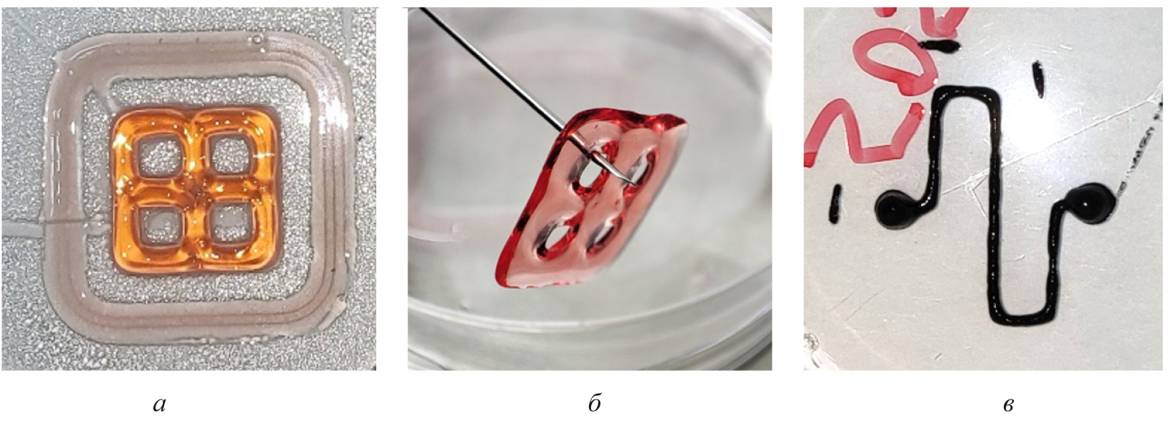 Рис. 3. Конструкты, полученные при печати биочернилами II и III типа: А – конструкт, напечатанный биочернилами II типа, состоящими из альгината натрия и желатина; Б – конструкт, напечатанный биочернилами II типа, состоящими из альгината натрия и желатина после обработки раствором глюконата кальция; В – структура в виде зигзагообразной прямоугольно изогнутой линии с приподнятыми площадками на концах, напечатанная биочернилами III типа, содержащими углеродные нанотрубки
