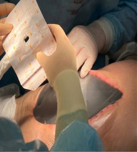 Удерживая покровную хирургическую пленку, открывали одну сторону прилипающей подложки удалением одного слоя и прикладывания к губке. Накрывали губку пленкой, сняв оставшиеся липкие слои для закрытия раны брюшной полости и оставшийся опорный слой. Пленка выходила на 5,0 см за границы раны и была прочно фиксирована, обеспечивая герметизм системы (рис. 5). Вырезали круглое отверстие диаметром около 1,0 см в центре пленки над раневым наполнителем. Снимали липкий слой с повязки дренажа с портом Soft port и располагали отверстие дренажа непосредственно над отверстием в прозрачной пленке. Разглаживали повязку, удаляя верхний стабилизирующий слой дренажа (рис. 6).