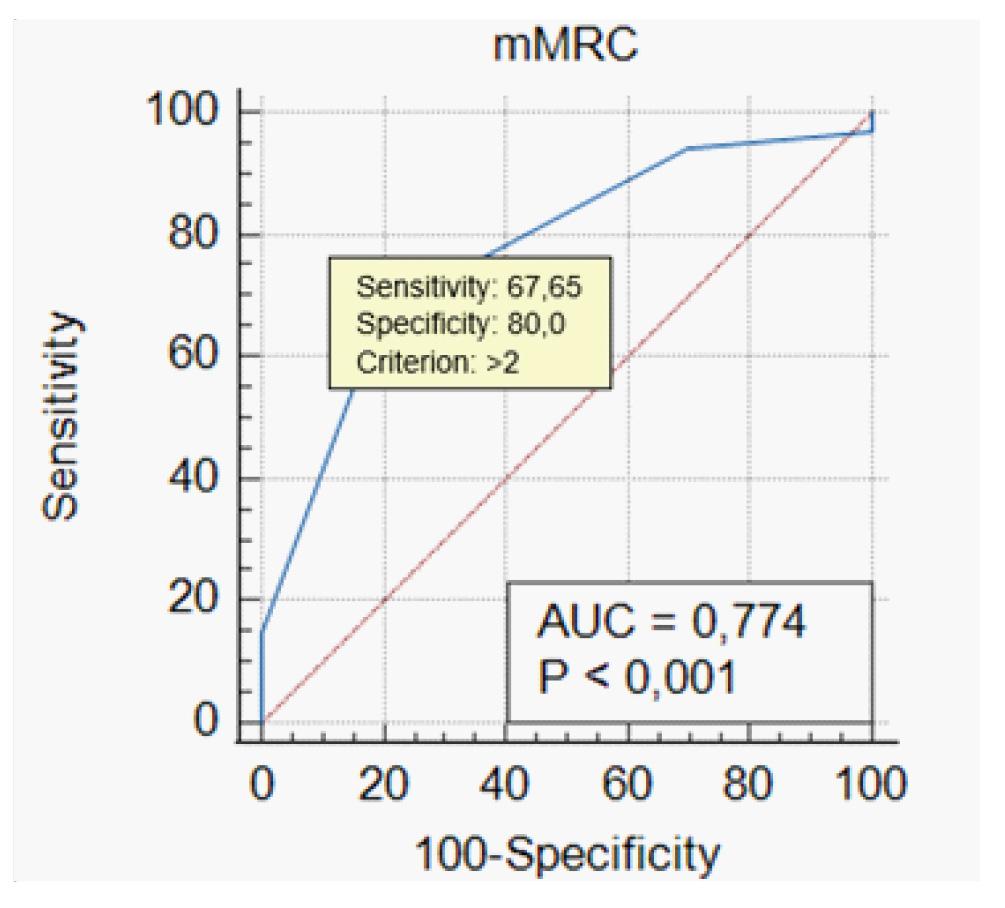 При построении ROC-кривой для всех значений по mMRC-опроснику была получена точка отсечения 2 балла (AUC = 0,774, p < 0,001) (рис. 1). Чувствительность и специфичность данного параметра составили 67,7 и 80,0 % соответственно.