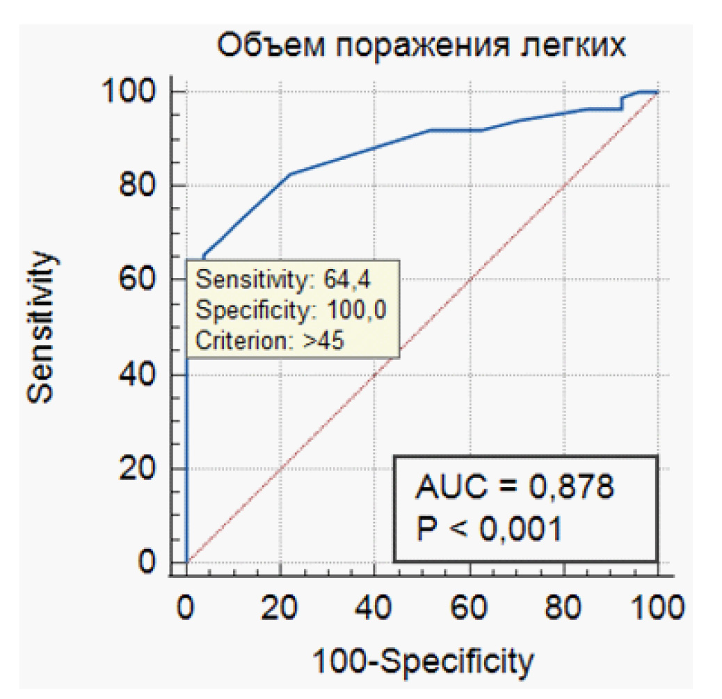 При построении ROC-кривой для всех значений объема поражения легких в % в острый период НКВИ у больных с одышкой и длительным постковидным синдромом была получена точка отсечения >45 % (AUC = 0,878, p < 0,001) (рис. 3). Чувствительность и специфичность данного параметра составили 64,4 и 100,0 % соответственно.