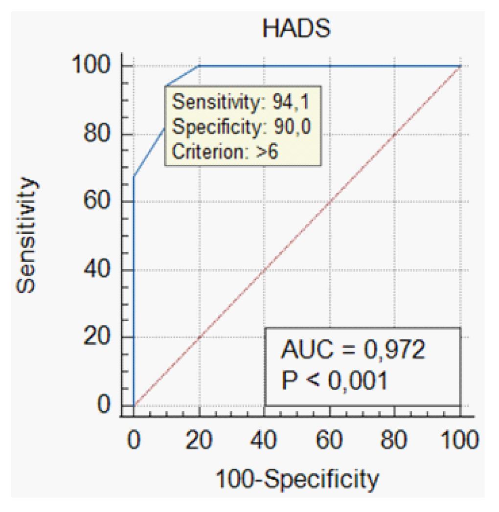 При построении ROC-кривой для всех значений баллов по шкале HADS была получена точка отсечения >6 баллов (AUC = 0,972, p < 0,001) (рис. 4). Чувствительность и специфичность данного параметра составили 94,1 и 90,0 % соответственно.