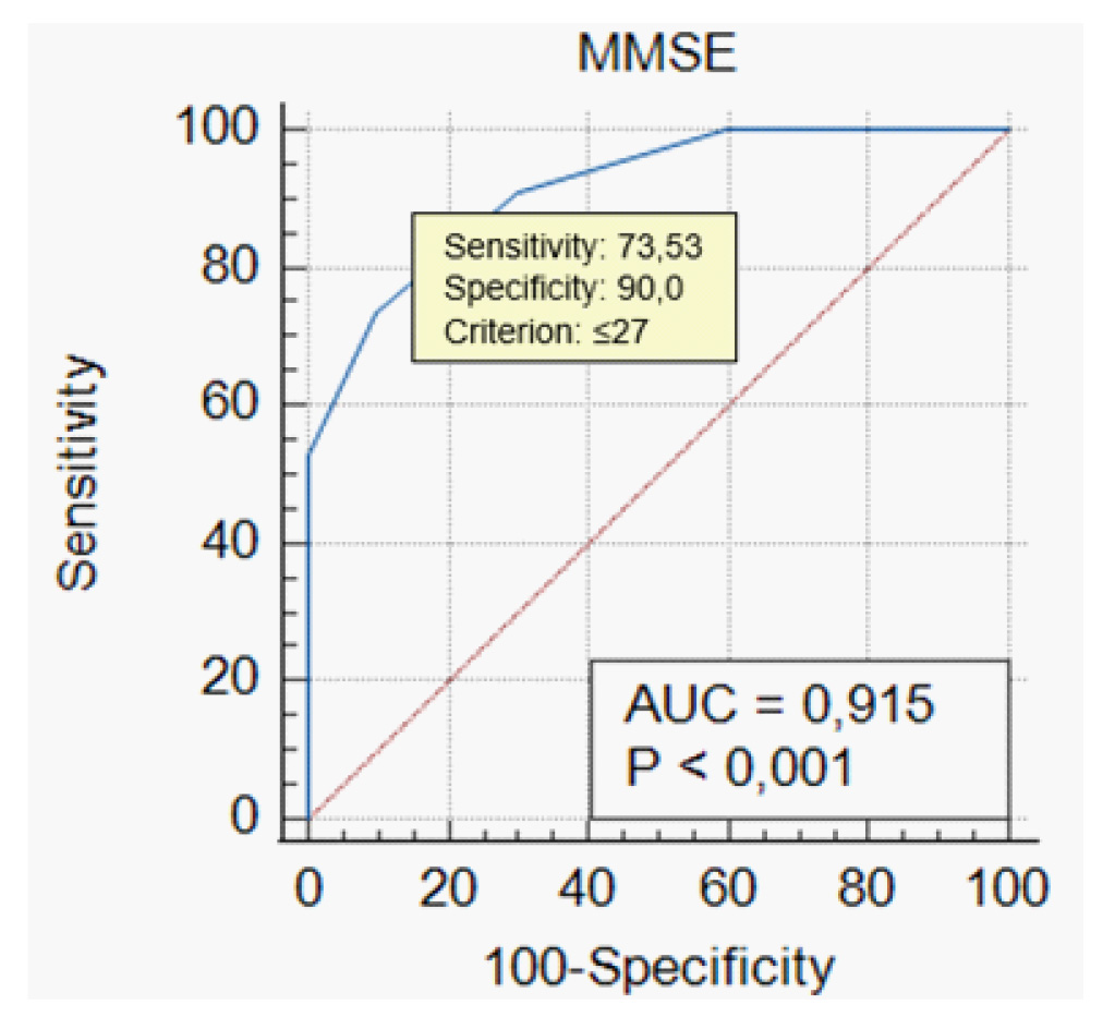 При построении ROC-кривой для всех значений баллов по шкале MMSE была получена точка отсечения ≤ 27 баллов (AUC = 0,915, p < 0,001) (рис. 5). Чувствительность и специфичность данного параметра составили 73,5 и 90,0 % соответственно.