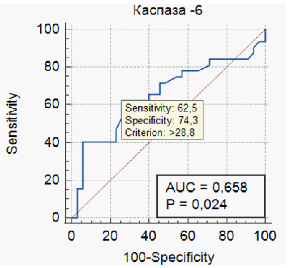При построении ROC-кривой для всех значений каспазы-6 была получена точка отсечения >28,8 пг/мл (AUC = 0,658, p = 0,024) (рис. 7). Чувствительность и специфичность данного параметра составили 62,5 и 74,3 % соответственно.