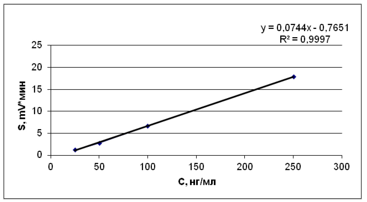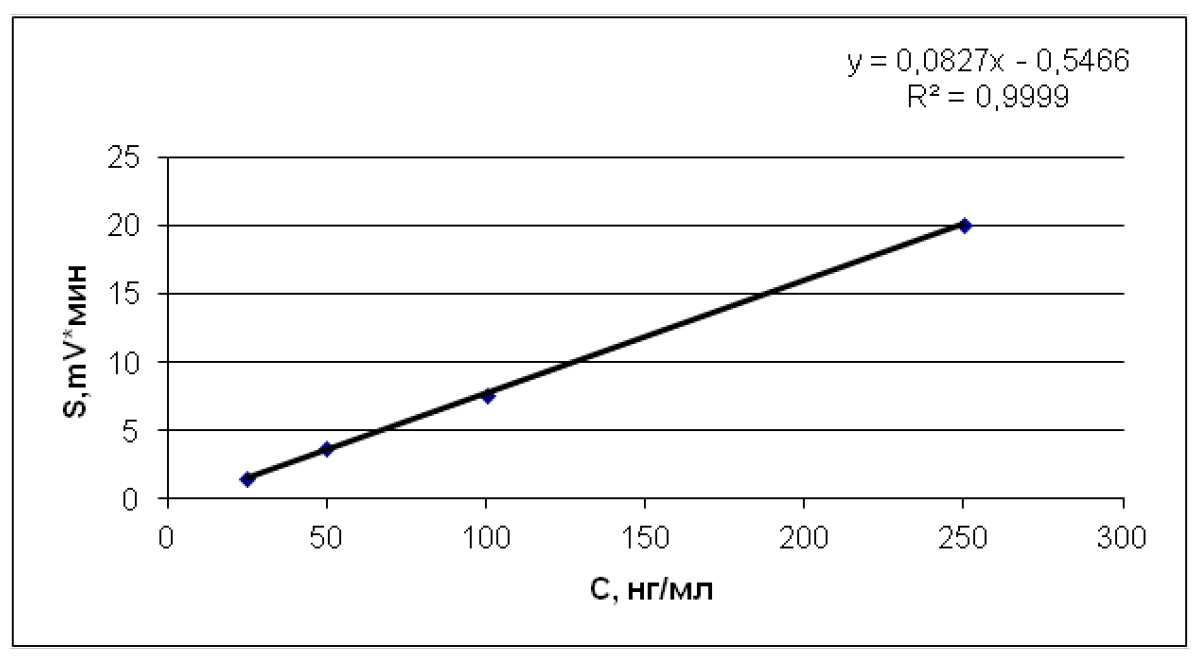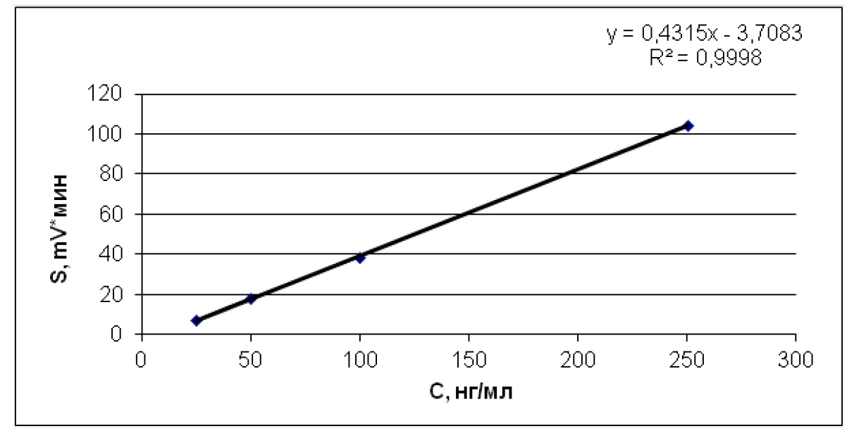 Валидация метода количественного определения проводилась путем построения калибровочных графиков уравнения прямой по трем дням исследования для каждого из водных растворов стандарта (рис. 1–4). Водные растворы стандартов объединялись в одну пробу с близкими концентрациями. Для каждой из концентраций анализировалось по 5 параллельных разведений.