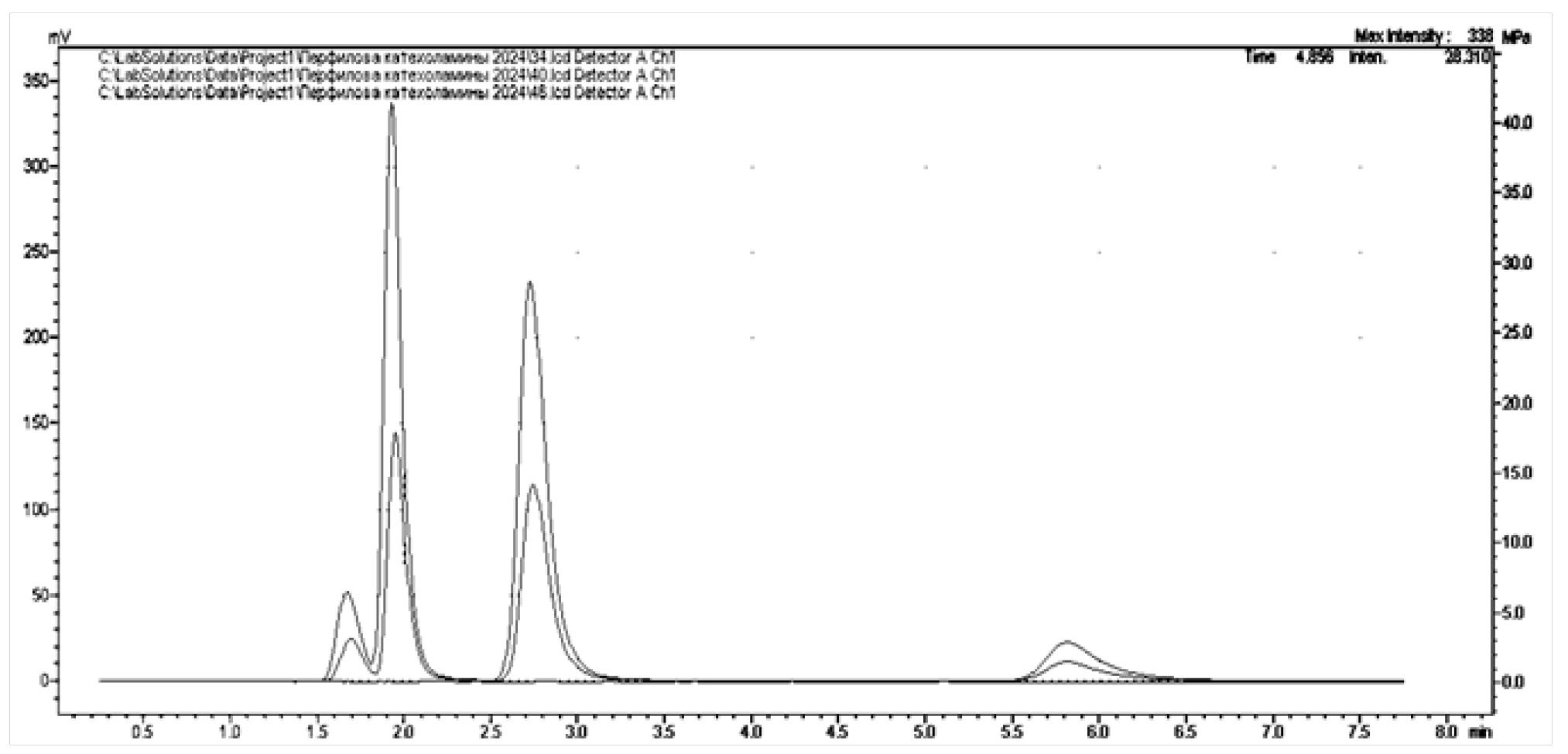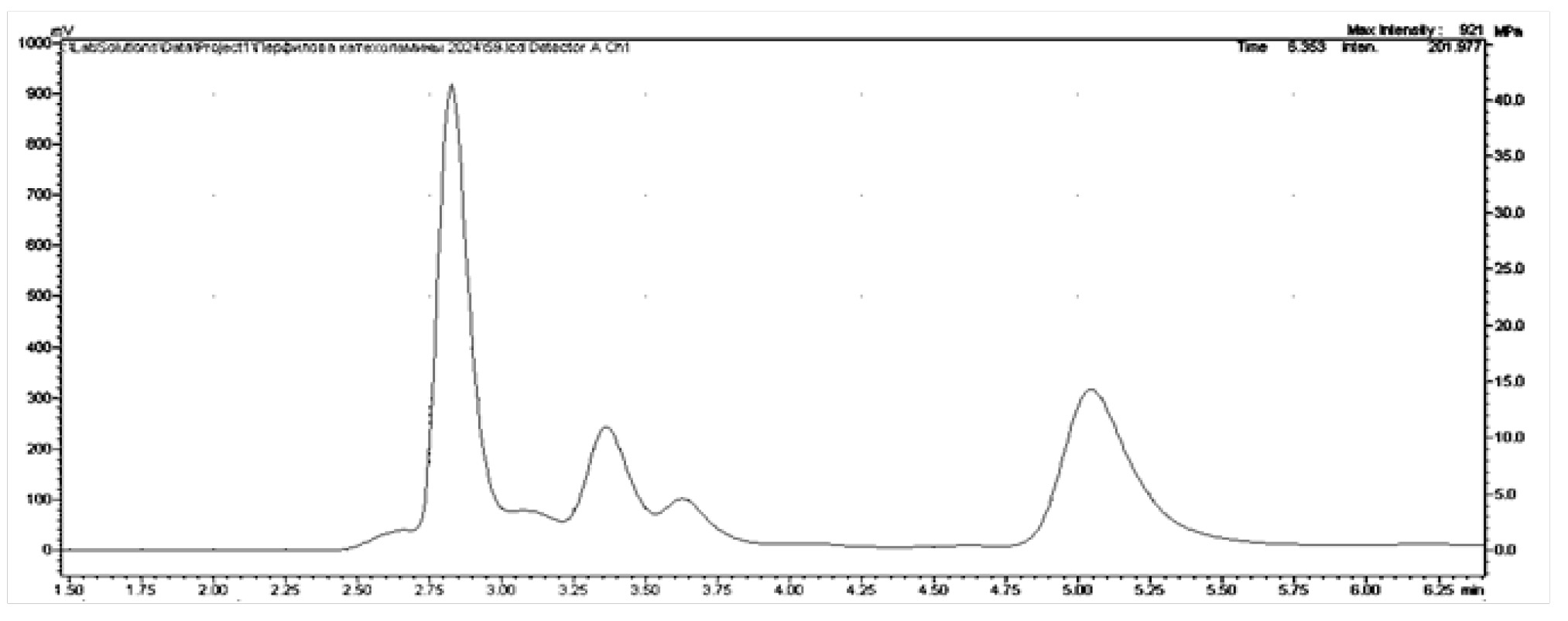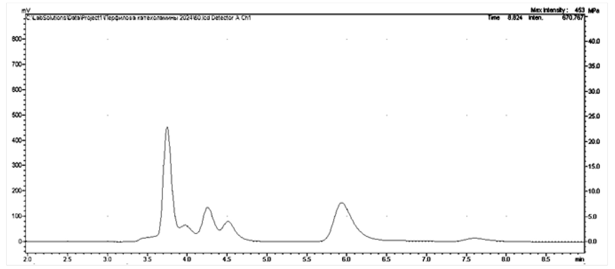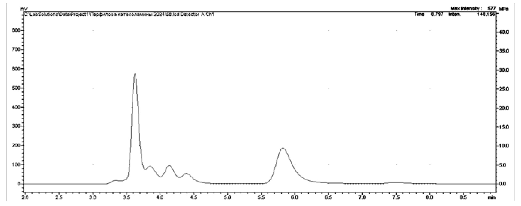 Были получены хроматограммы биологического фона проб различных отделов мозга крыс (рис. 6–10) и мозговых структур Danio rerio (рис. 11), в которых определялись искомые моноамины.