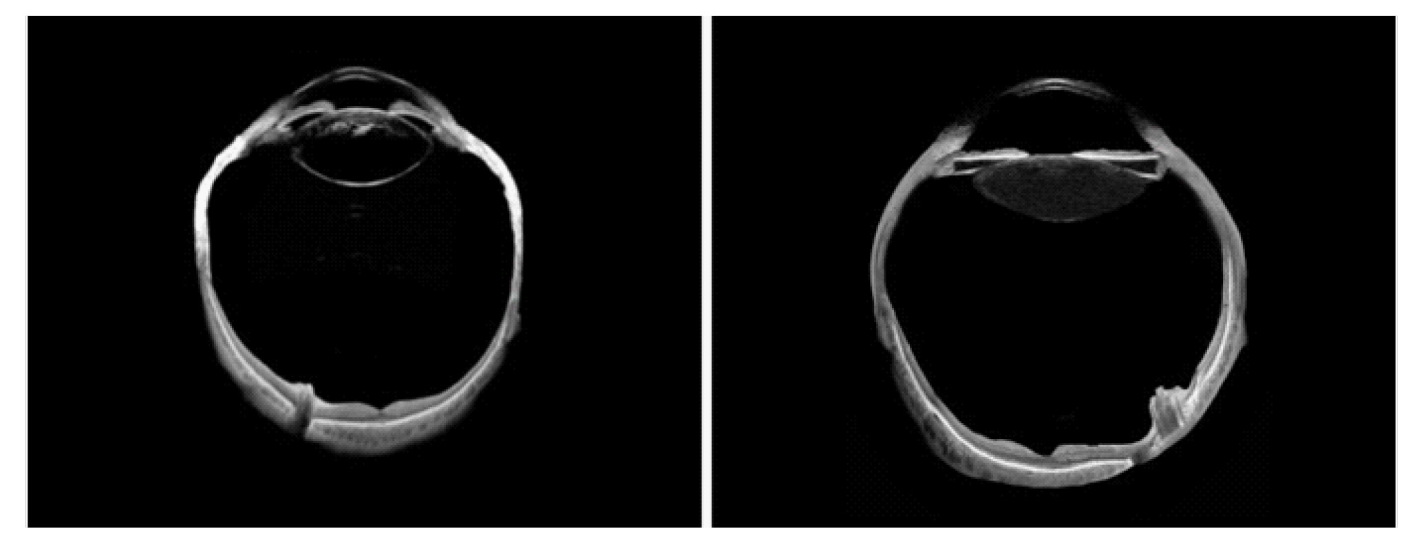 Настоящая работа иллюстрирует наличие статистически значимых различий в анатомии глазного яблока между пациентами, имеющими высокие степени гиперметропии и миопии.