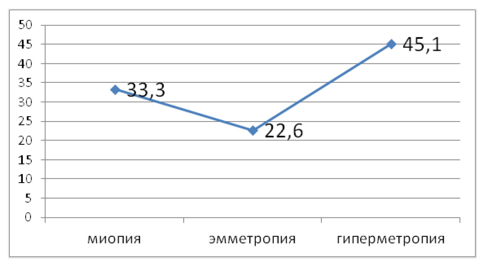 Сравнение распространенности рефракционного астигматизма по видам клинической рефракции глаз представлено на рис. 1. Определено наименьшее значение доли цилиндрического компонента при эмметропии (22,6 %), увеличение до 33,3 % при миопии и наибольший показатель 45,1 % при гиперметропии (р < 0,05).