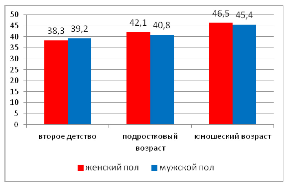Отдельно вычисляли долю роговичного астигматизма, у девочек 8–11 лет она составила 38,3 %, у мальчиков 8–12 лет – 39,2 %, показатель роговичного астигматизма повышается в подростковом возрасте незначительно (р > 0,05) и достигает максимальных значений у девушек (46,5 %) и у юношей (45,5 %) (р < 0,05).