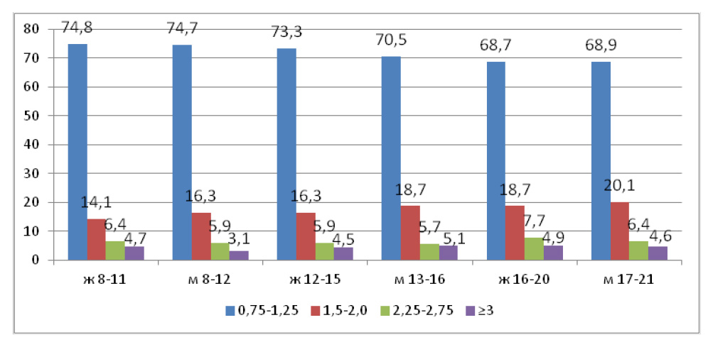 Во всех группах выявлено преобладание цилиндрической составляющей от 0,75 до 1,25 дптр, по мере увеличения величины астигматизма доля его снижается, показатель обследуемых с цилиндром величиной 3 дптр и более был минимальным (р < 0,05, хи-квадрат) (рис. 4). Результаты нашего исследования согласуются с параметрами распространенности астигматизма у учащихся от 7 до 19 лет в Синьцзяне, Китай, где также преобладал астигматизм значением 0,75 дптр [7].