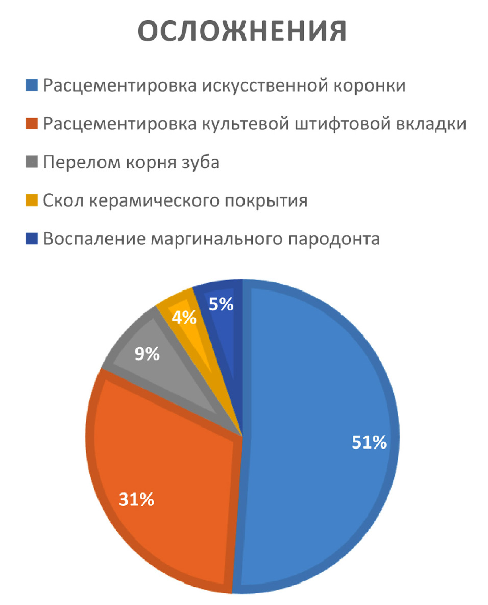 В ходе изучения амбулаторных карт стоматологических пациентов также проводили анализ осложнений, возникающих в ходе восстановления разрушенных клинических коронок зубов (рис.).