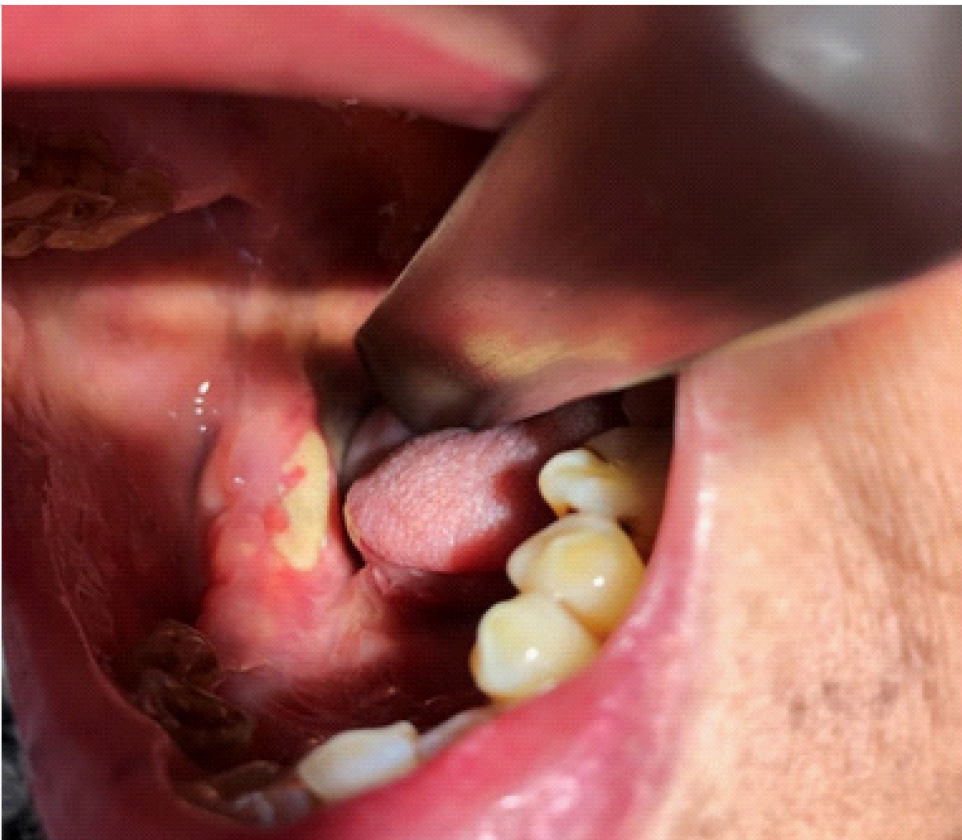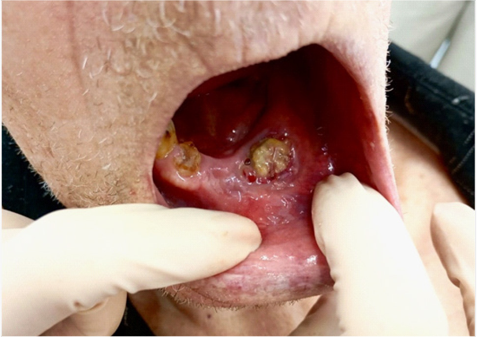 Из анамнеза заболевания выяснено, что зубы были удалены несколько лет назад, длительность возникновения язвы в полости рта и остеонекроза нижней челюсти не определяет. За медицинской помощью ранее не обращался.