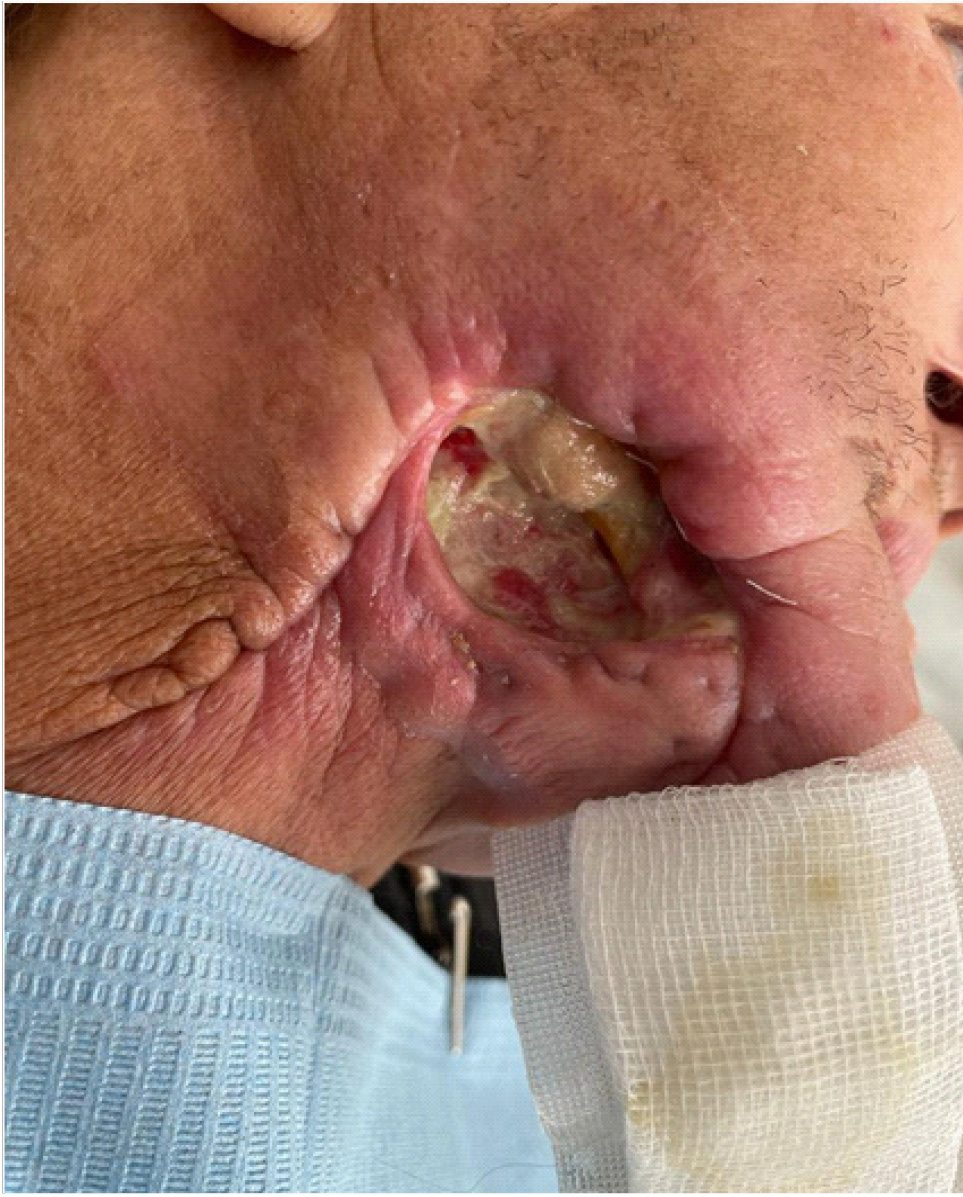 Рис. 7. Клинические проявление бисфосфонатного остеонекроза нижней челюсти слева