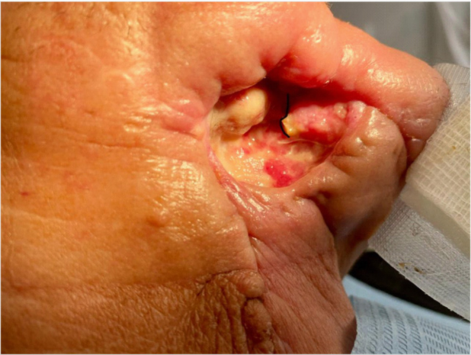 Рис. 5. Клинические проявления бисфосфонатного остеонекроза нижней челюсти справа у пациентки Б. в 2024 году