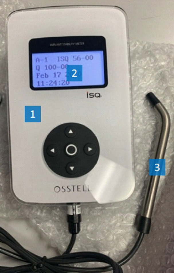 Рис. 2 демонстрирует устройство для резонансно-частотного анализа стабильности имплантата, состоящее из блока с компьютерным анализатором (1), электронного дисплея (2) излучателя-приемника электромагнитного поля и намагниченного штифта Smartpeg (3), который присоединяется к имплантату или абатменту, активируемому магнитным импульсом, генерируемым измерительным зондом ручного инструмента.