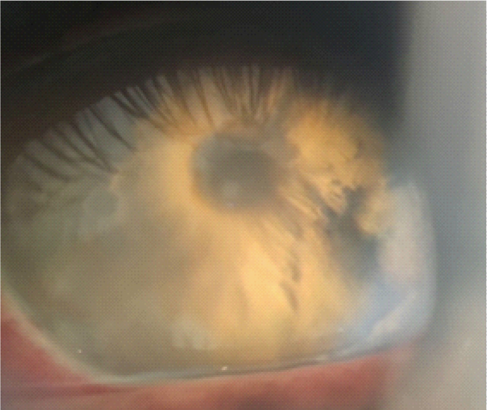 Максимально корригированная острота зрения (МКОЗ) правого глаза составляла 1.0, левого – соответствовала правильной светопроекции, пневмотонометрия OD – 19 мм рт. ст., офтальмотонус OS пальпаторно соответствовал норме. Данные биомикроскопии OD соответствовали норме. Биомикроскопия OS: отмечалась смешанная инъекция, определялись отечность роговицы и запотелость эндотелия, по меридиану 5 часов рубец, непрокрашивающийся флюоресцеином, влага передней камеры с гипопионом, в ткани радужки по меридиану 4–5 часов определялось объемное образование, реакция зрачка на свет отсутствовала (рис. 1). Визуализировалась афакия, в стекловидном теле – воспалительные клетки, детали глазного дна были трудноразличимы.