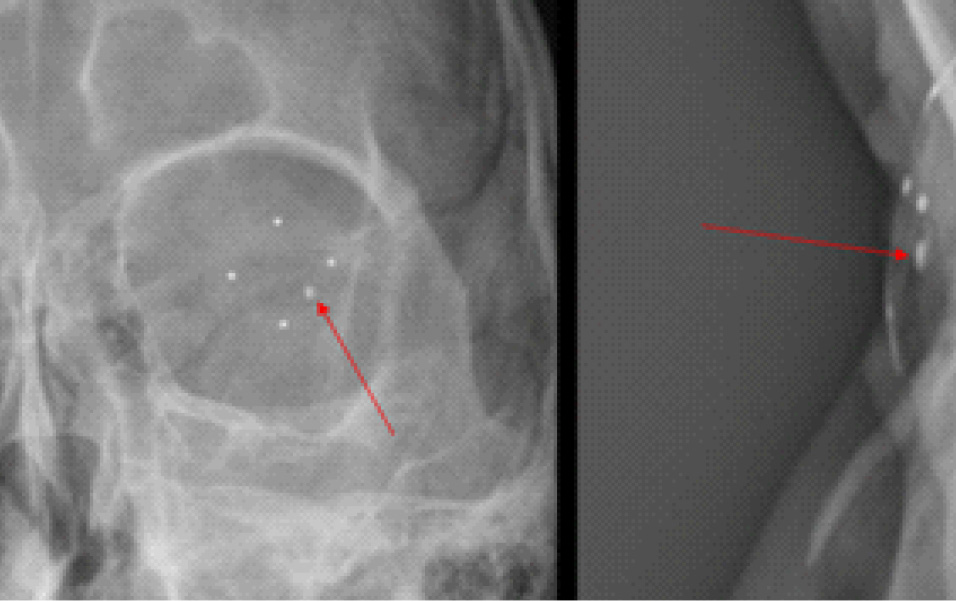 Пациенту был проведен комплекс инструментальных исследований, включающий в себя ультразвуковое исследование (УЗИ) и ультразвуковую биомикроскопию (УБМ), рентгенографию глазниц (РГ) с локализацией инородного тела по методу Комберга – Балтина, компьютерную томографию (КТ) головы. Эхографическая картина заднего сегмента OS имела следующие особенности: витреоретинальные тяжи, мелкодисперсная взвесь – выпот, хрусталик люксирован в стекловидное тело, нельзя исключить ВГИТ на глазном дне. УБМ выявила инородное тело в передней камере по меридиану 4–5 часов (рис. 2). При рентгенографии OS по Комбергу – Балтину определялось ВГИТ размерами 2 × 1 × 1 мм, по меридианам 4 часа 10 минут – 4 часа 40 минут, на расстоянии 4 мм от анатомической оси глаза, на расстоянии 1–2 мм от плоскости лимба (3–4 мм при пересчете на склеру) (рис. 3).