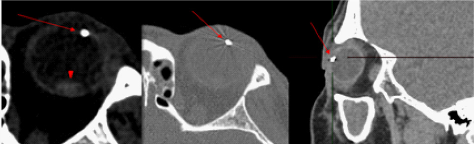 На компьютерной томограмме в передней камере глаза отмечалась структура диаметром 3,7 мм, металлической плотности до 3000 HU (Hounsfield Units) (рис. 4).