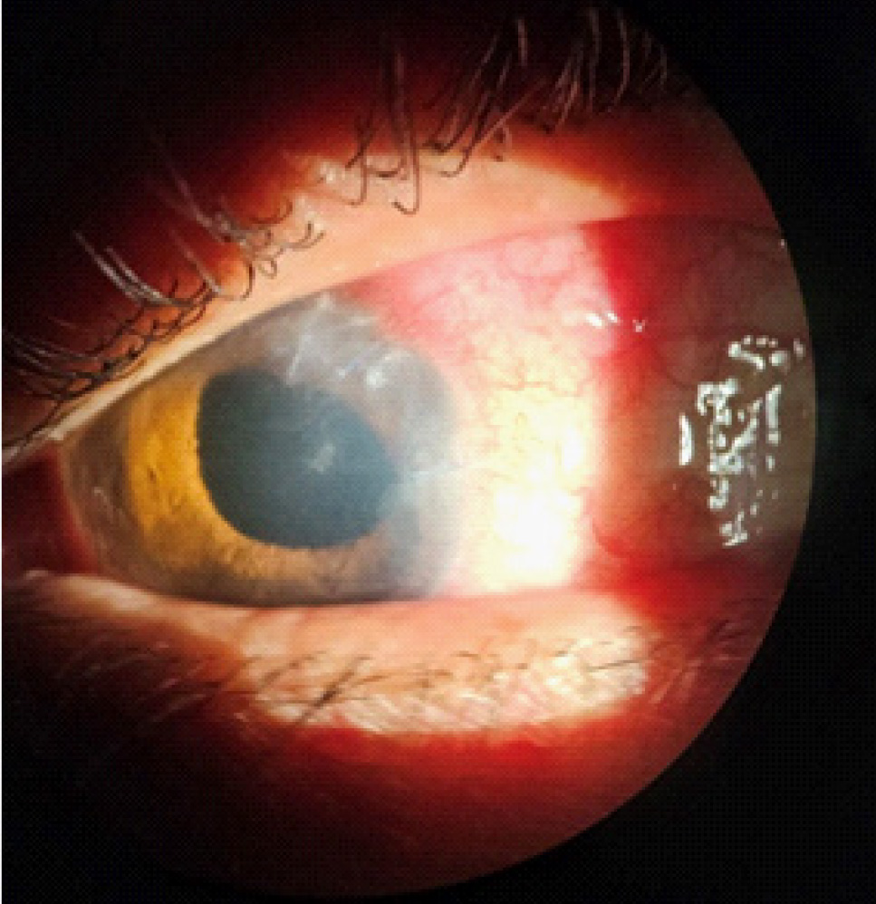 Пациент Т., 36 лет, обратился в приемное отделение с оказанием неотложной офтальмологической помощи Московского городского офтальмологического центра ММНКЦ им. С.П. Боткина с жалобами на снижение зрения, боль, слезотечение из левого глаза в течение недели. В анамнезе − проникающее ранение левого глазного яблока в 2007 году. Со слов пациента, он работал в одной из стран СНГ на стройке, другой работник ударил молотком по металлу, осколок отскочил Т. в левый глаз. В местной больнице инородное тело удалили, была произведена первичная хирургическая обработка раны, в дальнейшем у офтальмолога не наблюдался.