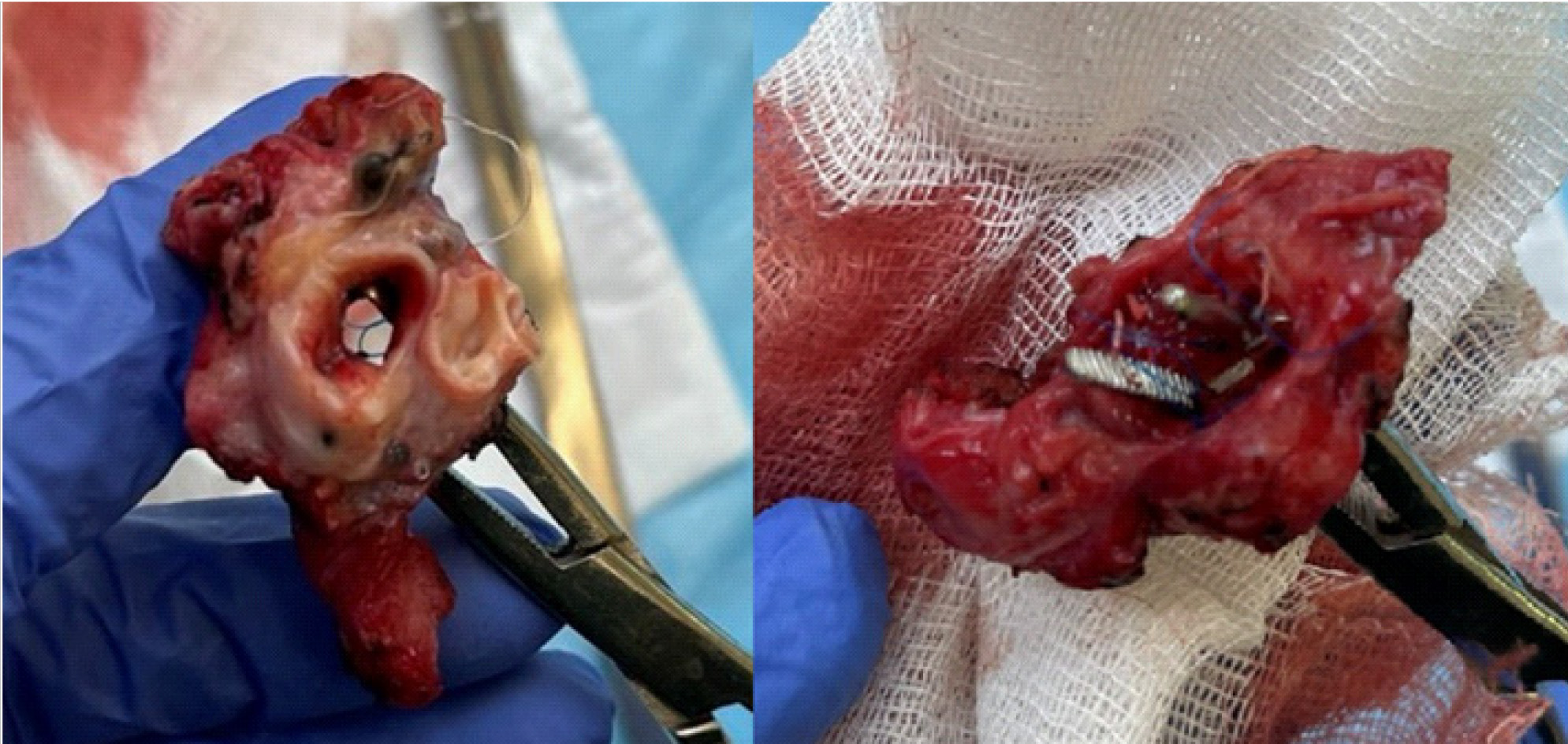 Рис. 2. Макроскопическая картина удаленного материала. Определяется дефект культи промежуточного бронха справа