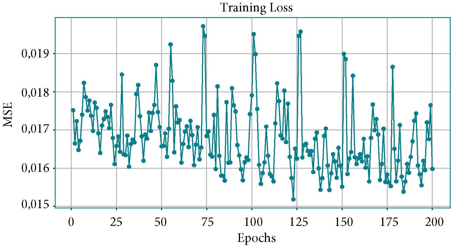 Отметим, что явной тенденции к снижению функции потерь MSE во время обучения на 200 эпохах не наблюдается (см. рис. 2). Это связано с адекватной работой механизмов регуляризации Dropout и L2, которые не позволяют модели LSTM переобучаться, сохраняя величину MSE во время обучения на достаточно стабильном уровне.