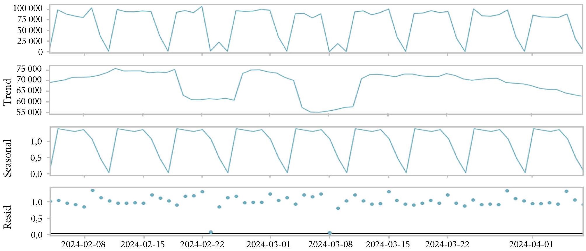 Таким образом, модель с декомпозицией данных продемонстрировала сопоставимое качество с моделью случайного леса. Обе модели показали высокую эффективность, но при сравнении суммы недельных прогнозов модель с декомпозицией оказалась более точной. В качестве вывода необходимо отметить, что выбор между моделями зависит от постановки конкретной задачи. Так, в случае, когда требуется короткий прогноз по дням, лучше использовать модель случайного леса, если же необходим прогноз на неделю в целом, то более предпочтительной является модель с декомпозицией данных. Иными словами, важно подходить к выбору модели, отталкиваясь от цели прогнозирования и требуемой точности прогнозов.