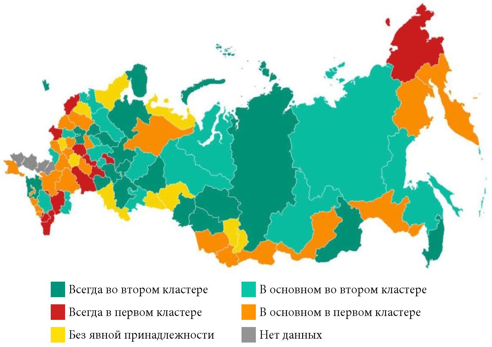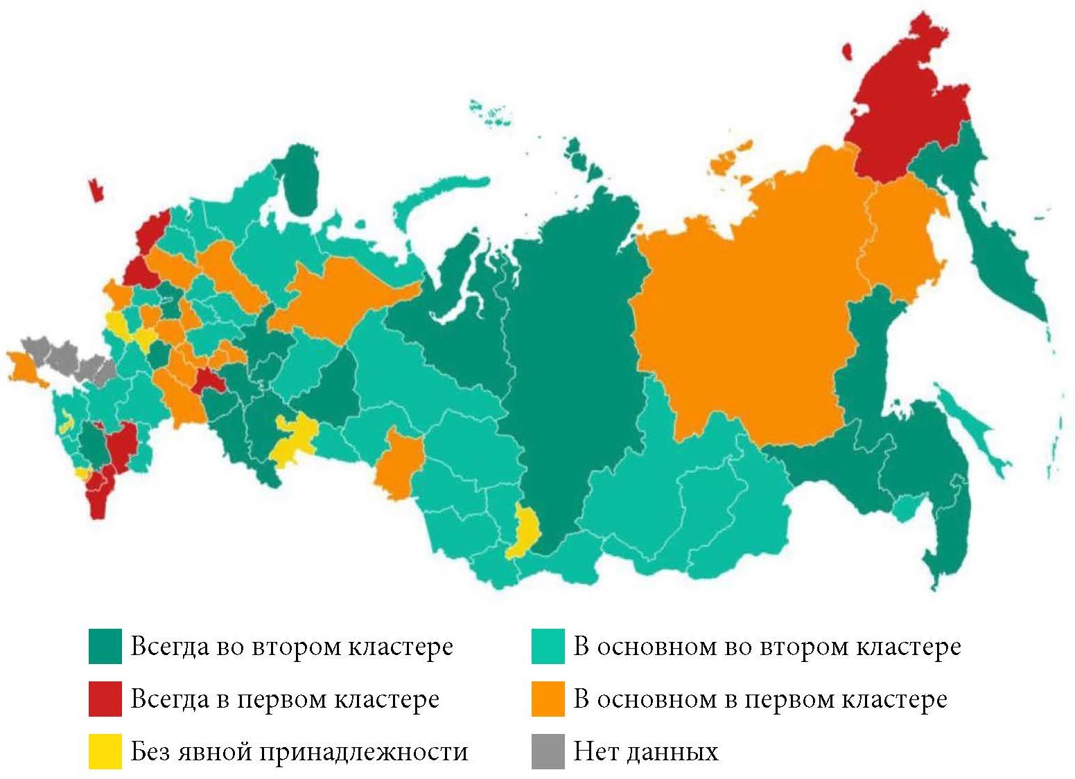 2 На всех картограммах темно-зеленым цветом обозначены регионы, которые попадали во второй кластер в каждом из рассматриваемых периодов; красным – регионы, которые в каждом из рассматриваемых периодов присутствовали в первом кластере; светло-зеленым – регионы, которые как минимум в течение трех лет из пяти попадали во второй кластер; оранжевым – регионы, которые как минимум в течение трех лет из пяти находились в первом кластере.