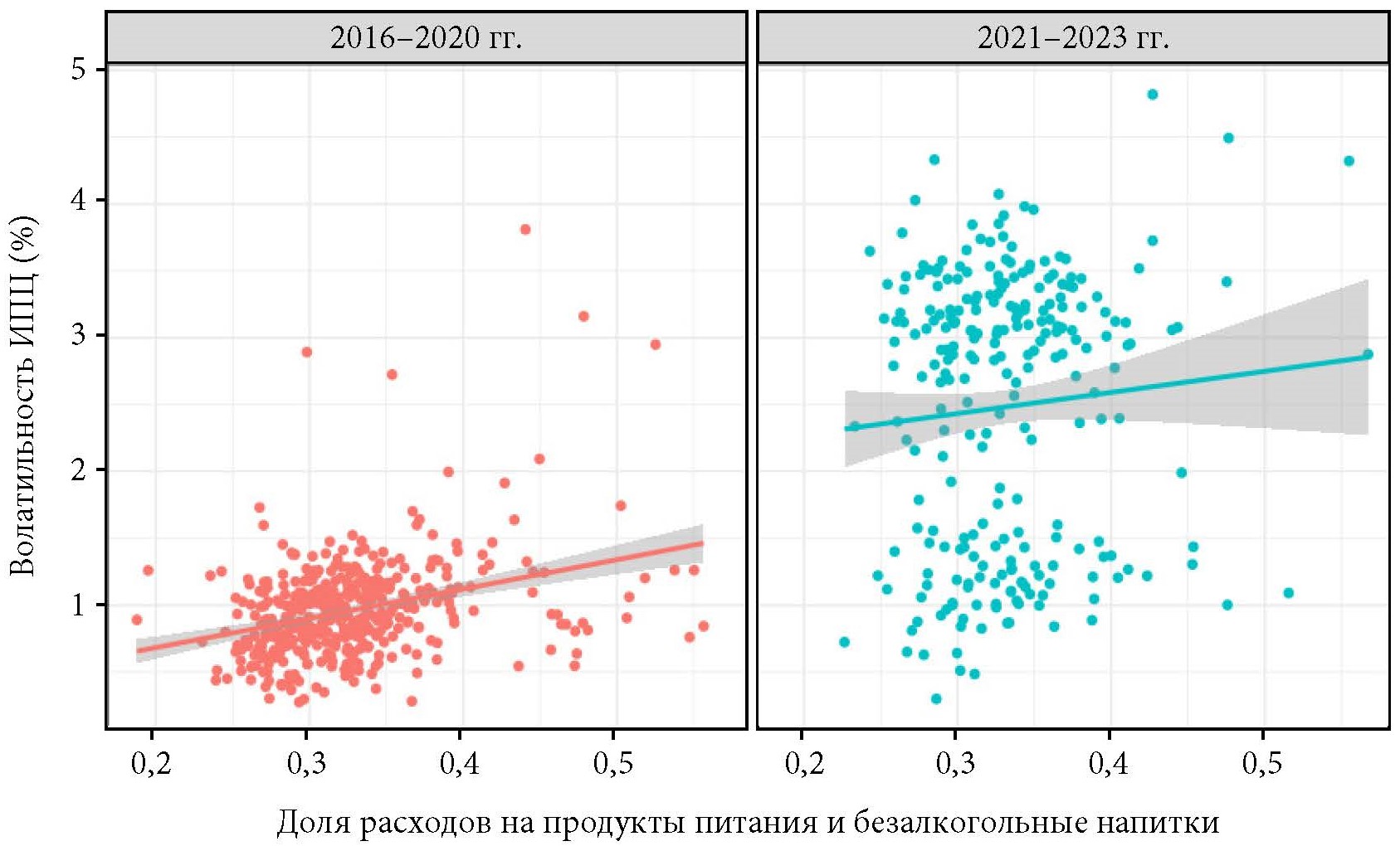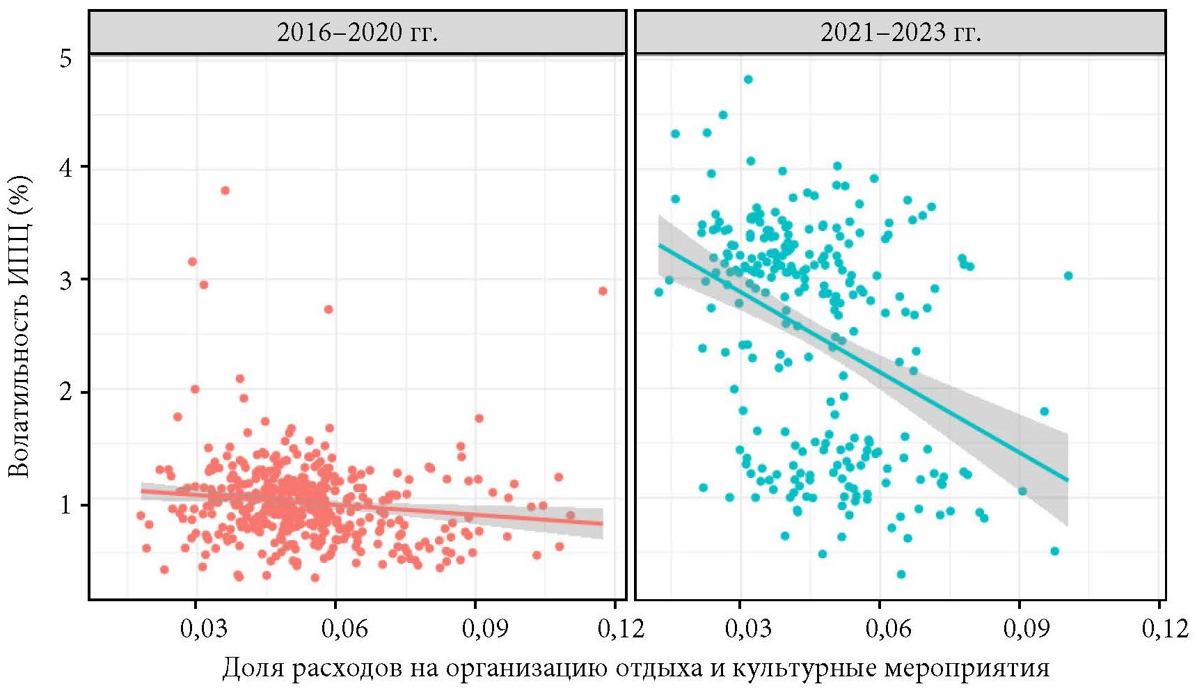 Вместе с тем с 2021 г. связь между волатильностью ИПЦ и долей расходов на отдых стала более явной, чем ранее: подтверждением этому является изменение угла наклона кривой в период с 2021 по 2023 г. на рис. 9.