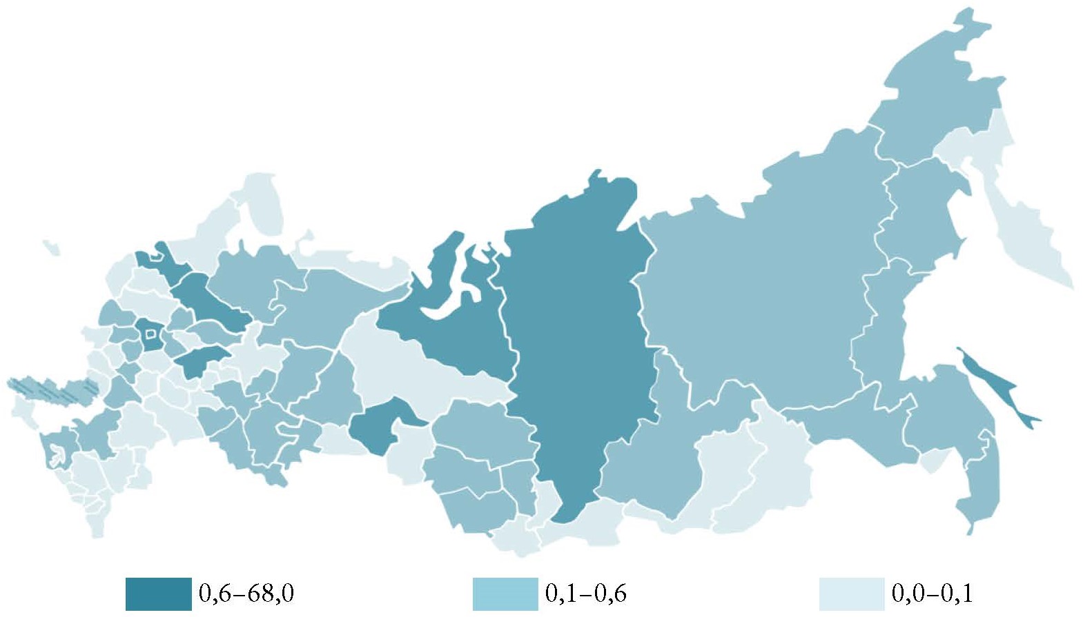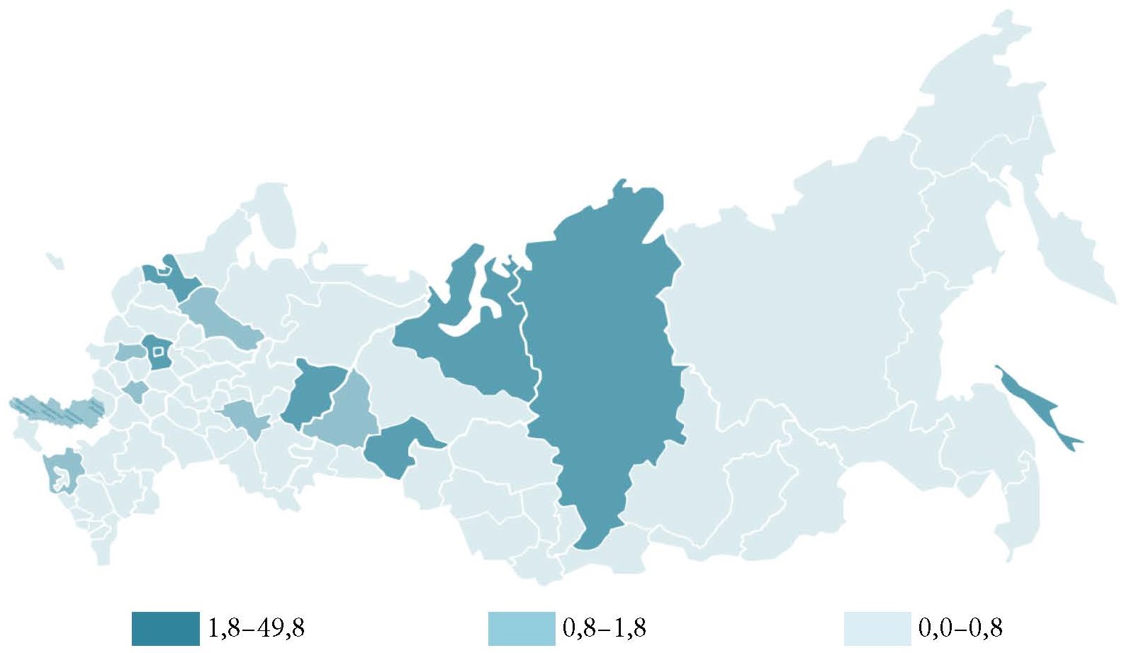 Fig. 3. Spatial distribution of the Russian regions by investment openness, 2015
