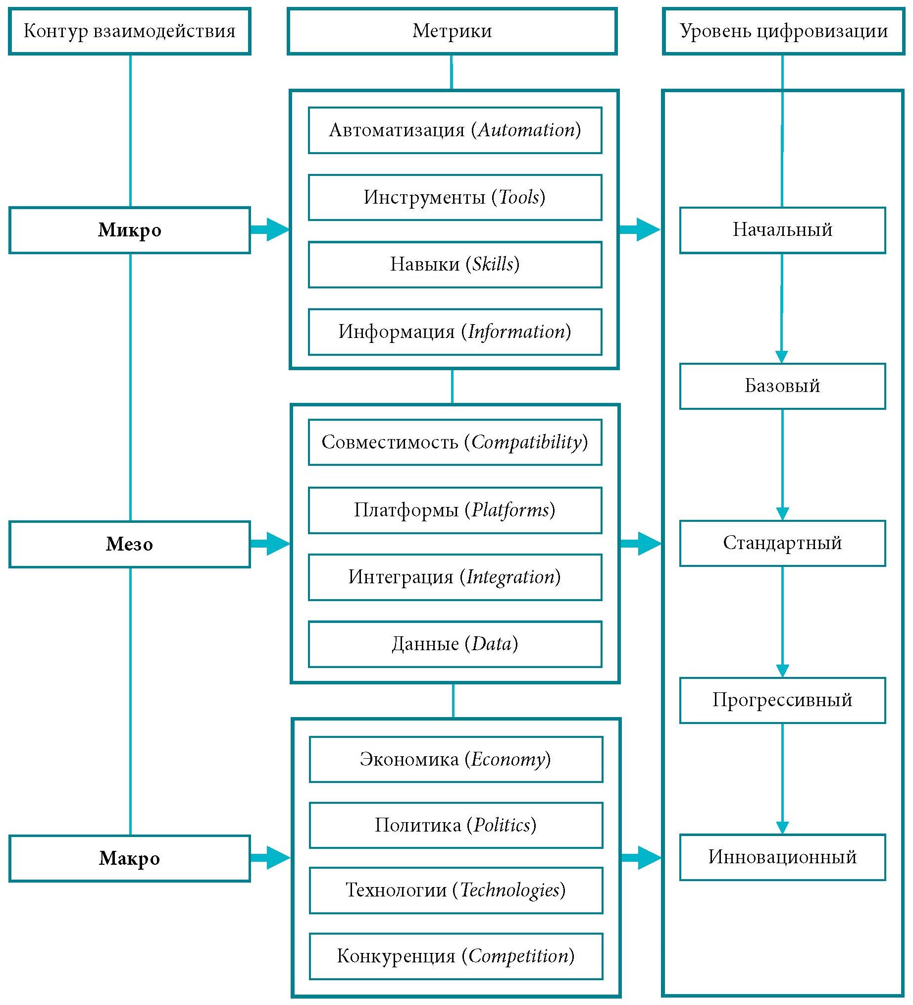 Цель исследования – обоснование декомпозиционного подхода к измерению цифровой зрелости организации на основе метрик цифрового развития в пределах микро-, мезо- и макроконтуров взаимодействия.