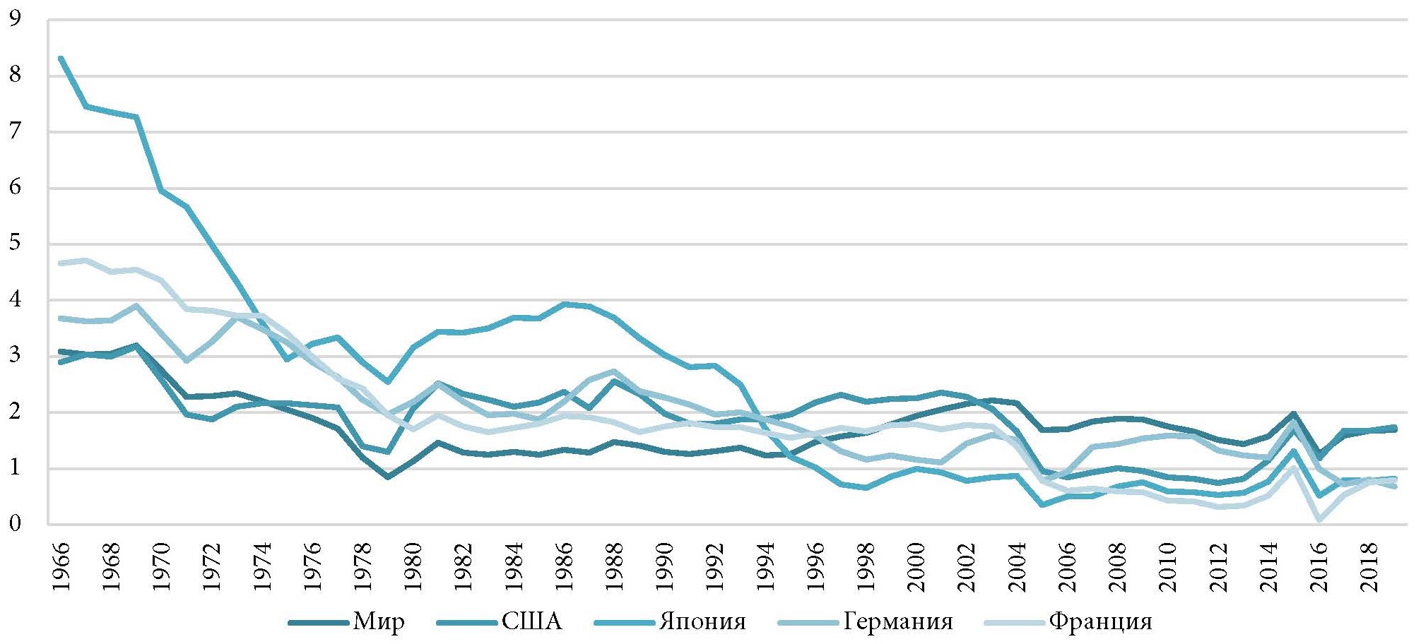 На рис. 1 показаны среднегодовые темпы роста реального ВВП на душу населения, сглаженные методом скользящего среднего с окном в 10 лет. Примерно с 2006 г. средние темпы экономического роста в развитых странах снижаются: так, в период с 2005 по 2019 г. темпы экономического роста в США составили примерно 1 %.
