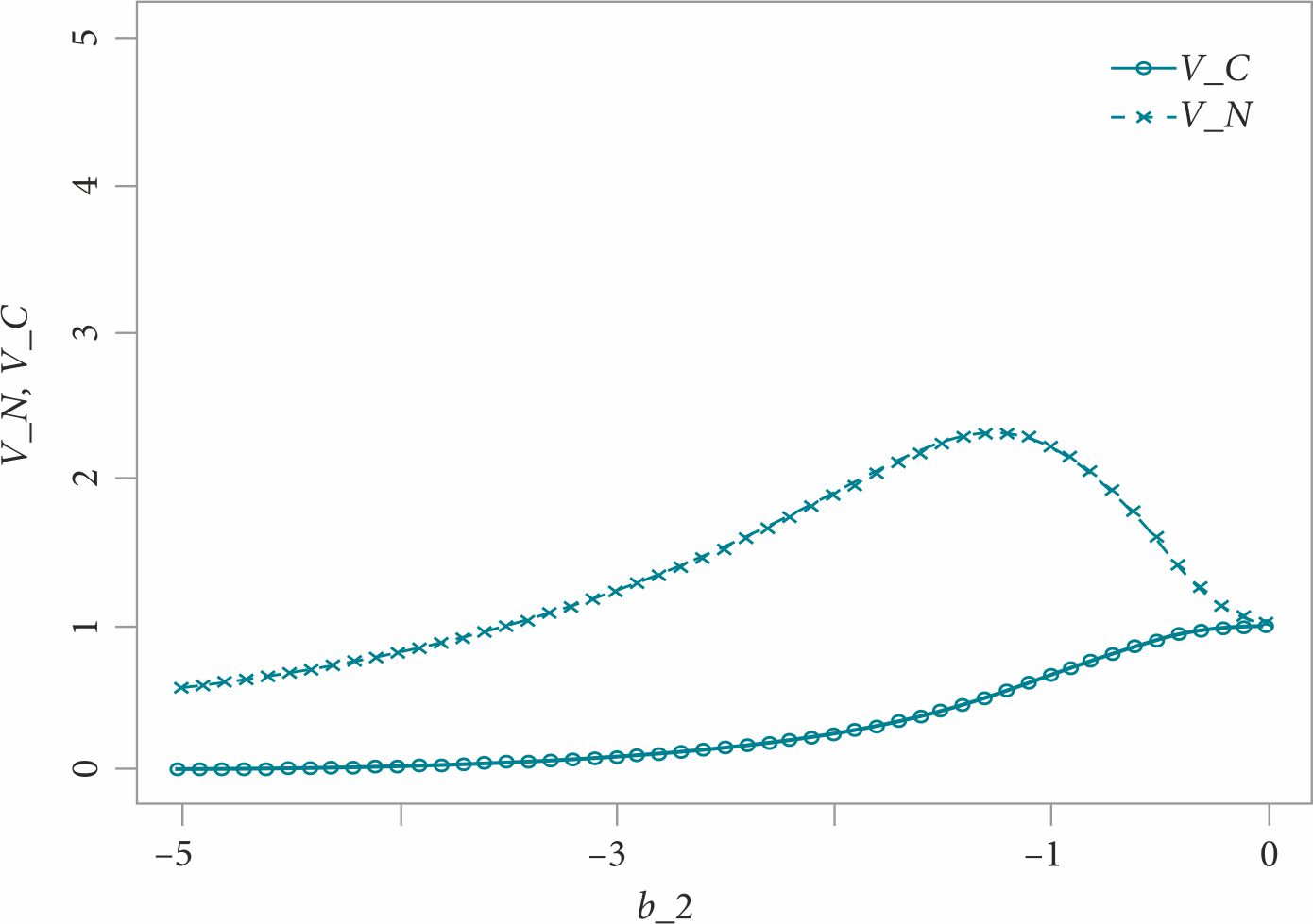 Рис. 1. Влияние параметра b₂ на функцию потерь при монетарной политике координации (V_C) и политике отсутствия координации (V_N)